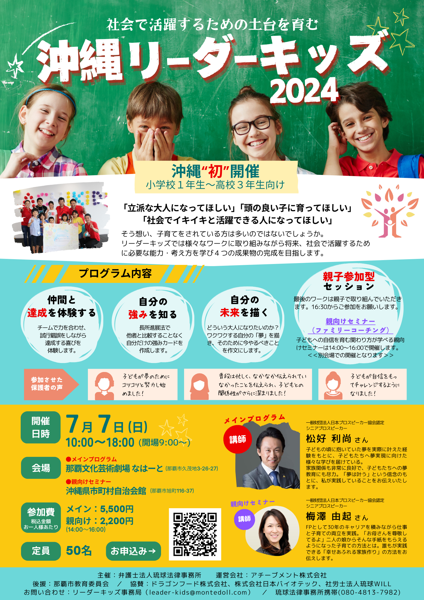 弁護士法人琉球法律事務所(沖縄県那覇市)が主催し、那覇市教育委員会が後援、ドラゴンフード株式会社、株式会社日本バイオテック、社会保険労務士法人琉球WILLが協賛する『沖縄リーダーキッズ』を、7月7日(日)那覇文化芸術劇場なはーとにて開催いたします。
