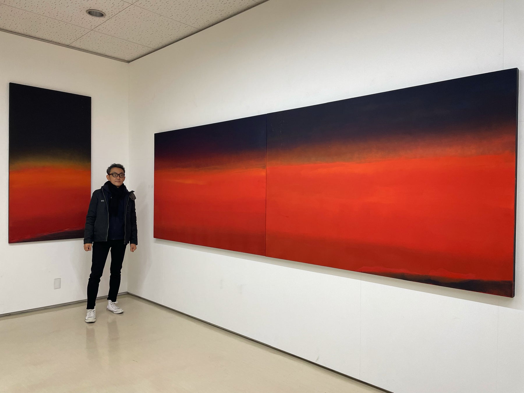 作品は、昭和20年に飯能に一時的に疎開していた母親が、約10万人の犠牲者を出した昭和20年3月10日の夜「東京大空襲」で、焼夷弾によって焼き尽くされる東京の赤い炎の空を目撃した記憶を、そして飯能から帰省して対面した世田谷の焼け跡をも絵画によって再現することを試みたものだ。その母親の記憶をひもとくために、何度もの質疑応答を繰り返し、さながらモンタージュ写真の制作プロセスのように視覚的な「色彩のイメージ」を共有し作品に仕上げていく作業は、戦争を知らない世代が戦争の「実相」を伝える方法の1つの可能性を示したものということができる。