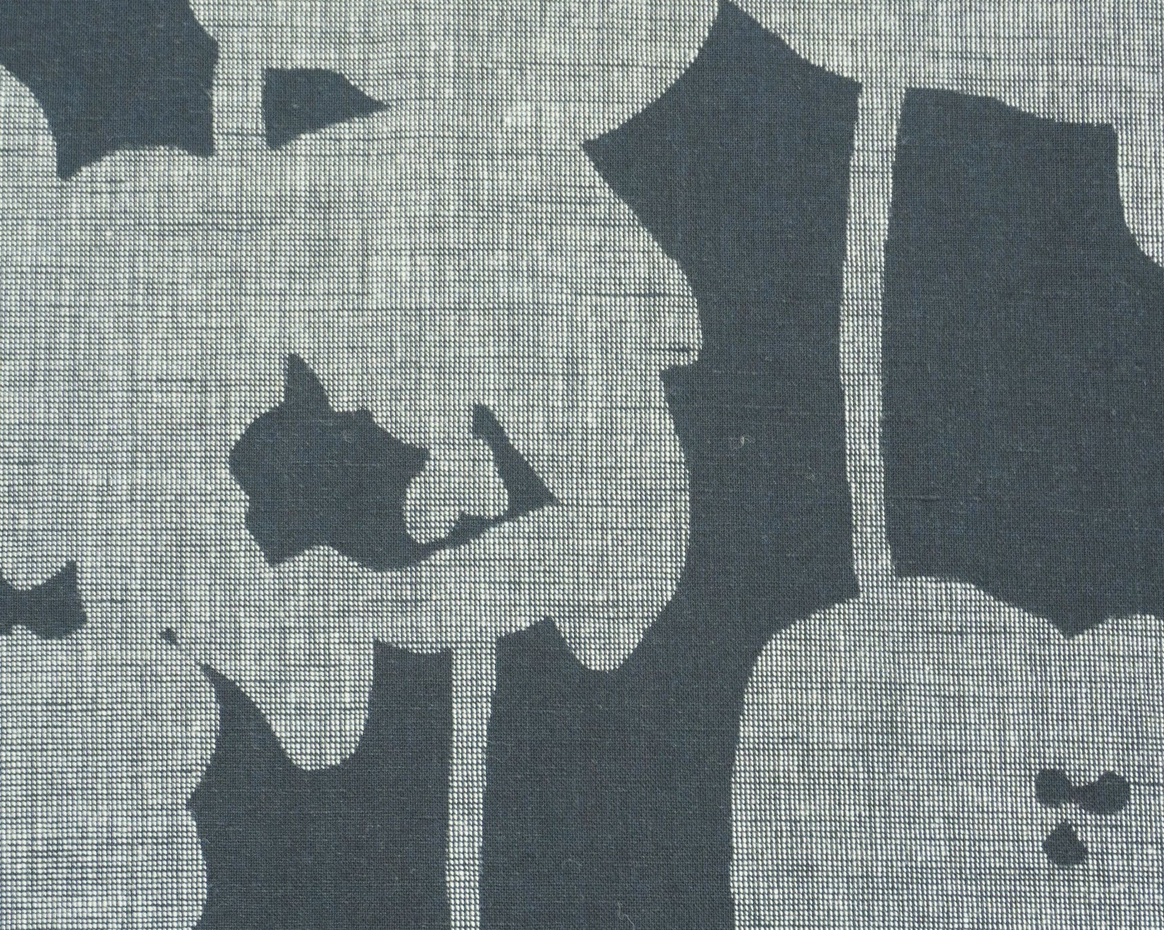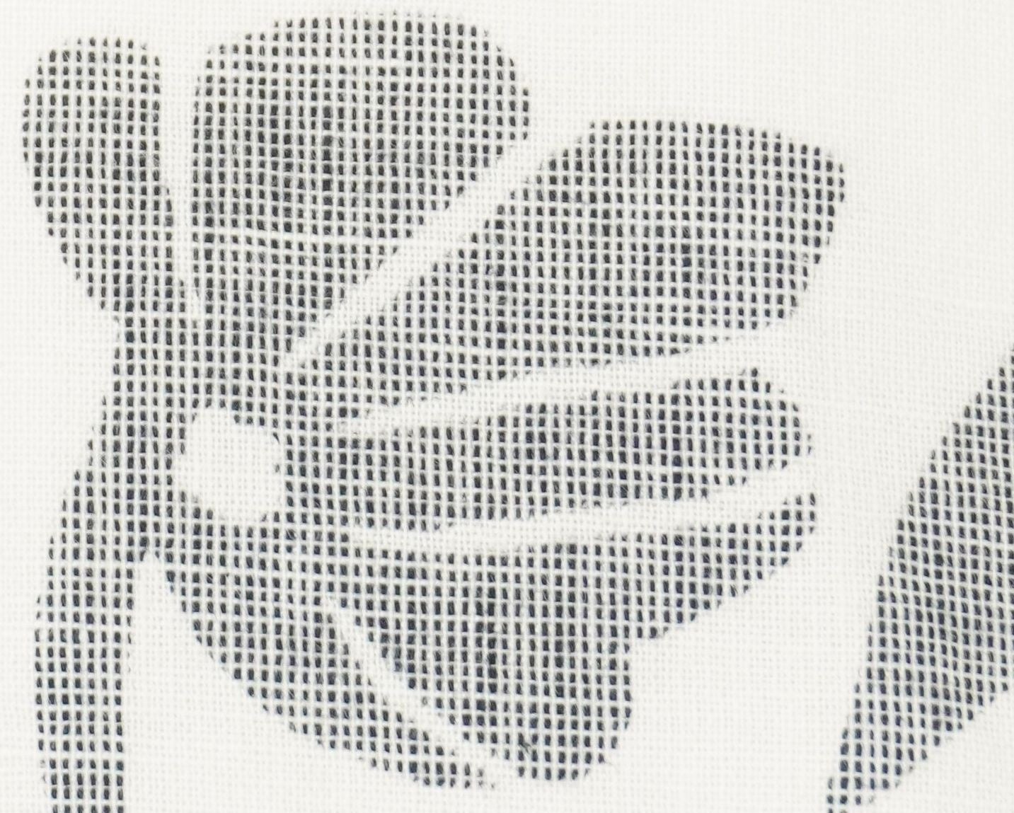 織りの段階で、マンガン染糸とマンガン染めではない糸を交互に配すことで、伝統的な絣の特徴を表現しています。プリントの工程では、糊づけ後におがくずをまぶす作業など、通常のプリントとは一線を画す手法がとられ、その仕上がりは均一的なプリントとは異なる、特殊な染色ならではの味とも言えるムラがあります。また、糸の太細による凸凹とした表情も見て取れます。