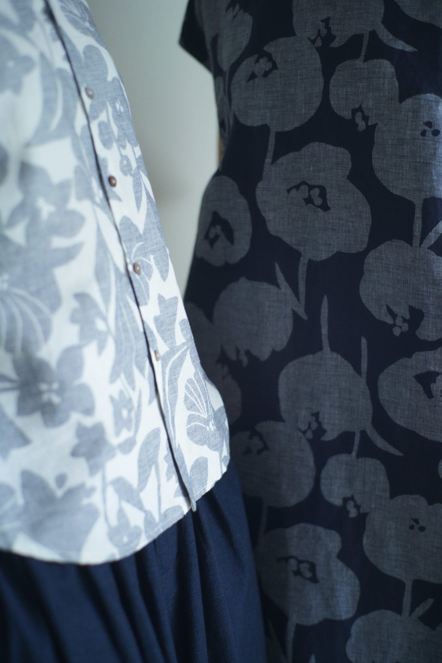 今年は、5月に紺地の「昼咲月見草柄」、6月に白地の「夏霞柄」を発売しました。暑い季節にさらりとした風合いの、リネンコットン素材です。8分袖のシャツは、夏の羽織りとしても着られます。和服から生まれた世界にここだけの染め絣、日本の夏の風情になじむ装いはいかがでしょう。