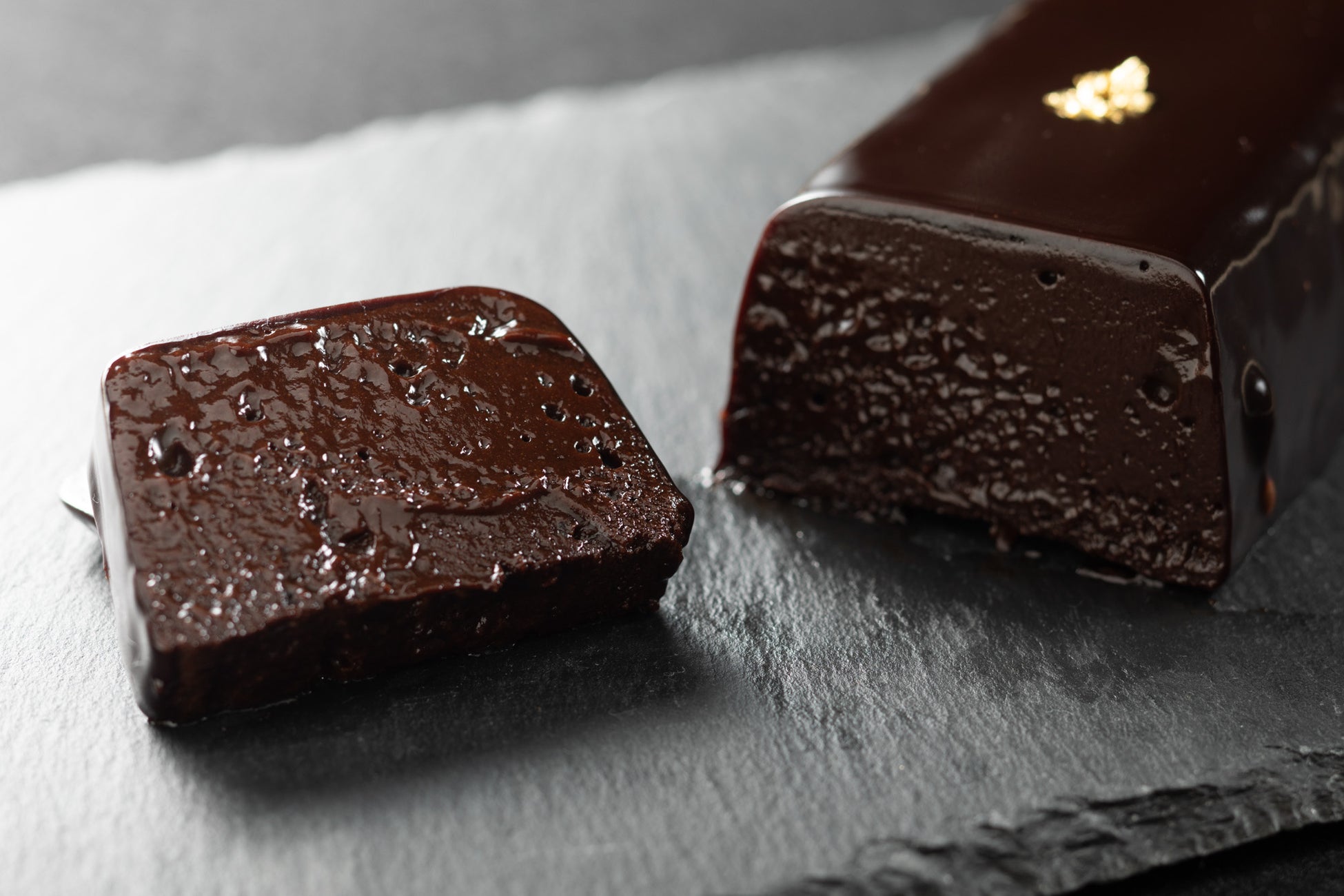 フルサイズ、ハーフサイズの商品は、テリーヌ生地の上から艶感のあるココア風味のグラサージュソースを掛けています。