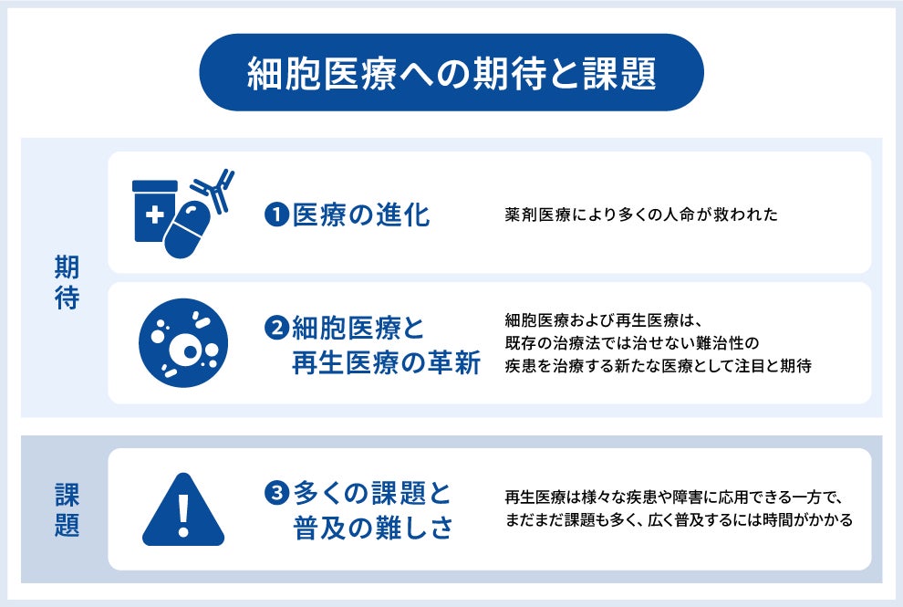 従来、有効な治療法がなかった疾患に対する新しい治療法として、細胞医療や再生医療の研究が進んでいます。しかし、細胞医療(細胞組織の採取から移植まで)における、治療用細胞の製造において「有効性、安全性、大量培養、コスト、倫理的問題、免疫拒絶反応」の各面で高い水準を満たす必要があり、広く普及するには時間がかかることが懸念されています。細胞医療の普及にはこのような様々な課題を解決する必要があります。