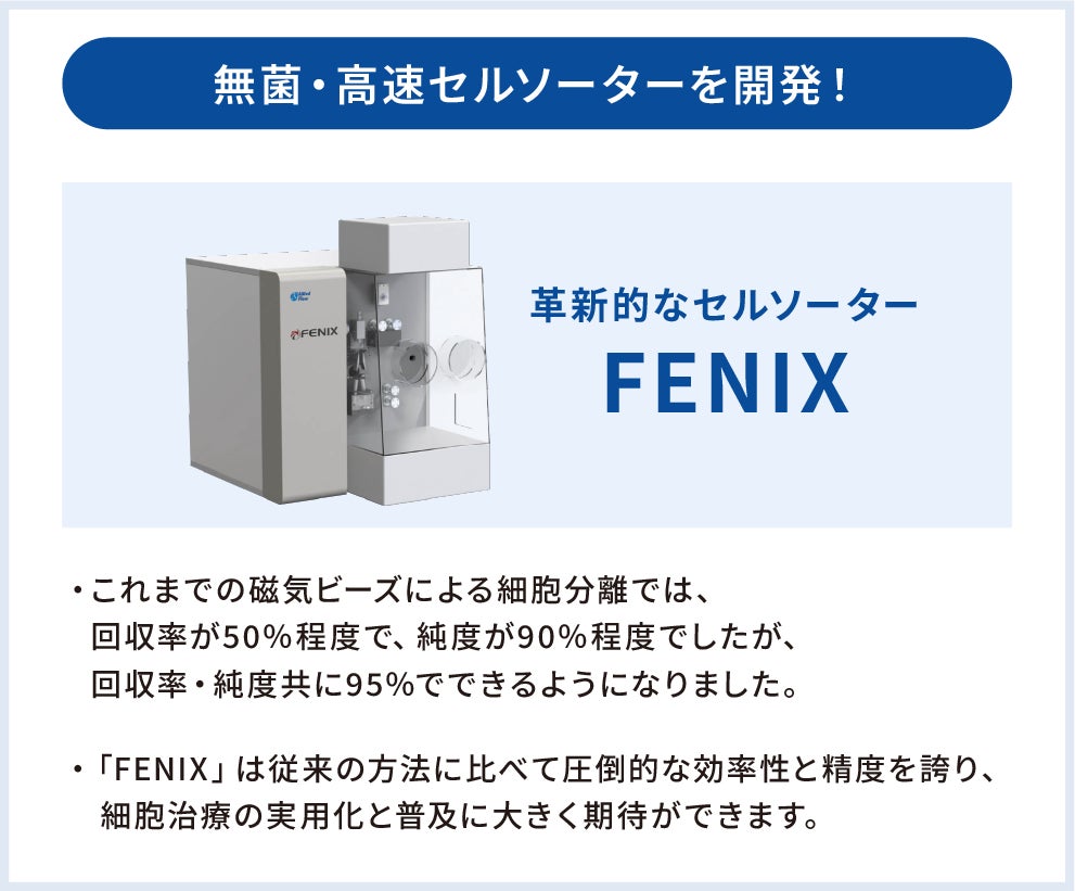 【治療法がない病気で苦しむ患者さまに希望の光を!】臨床効果の高い細胞を効率的に選別・分離する世界初の除染機能付き高速Droplet型セルソーター(FENIX)を開発し、再生医療の進化に貢献!