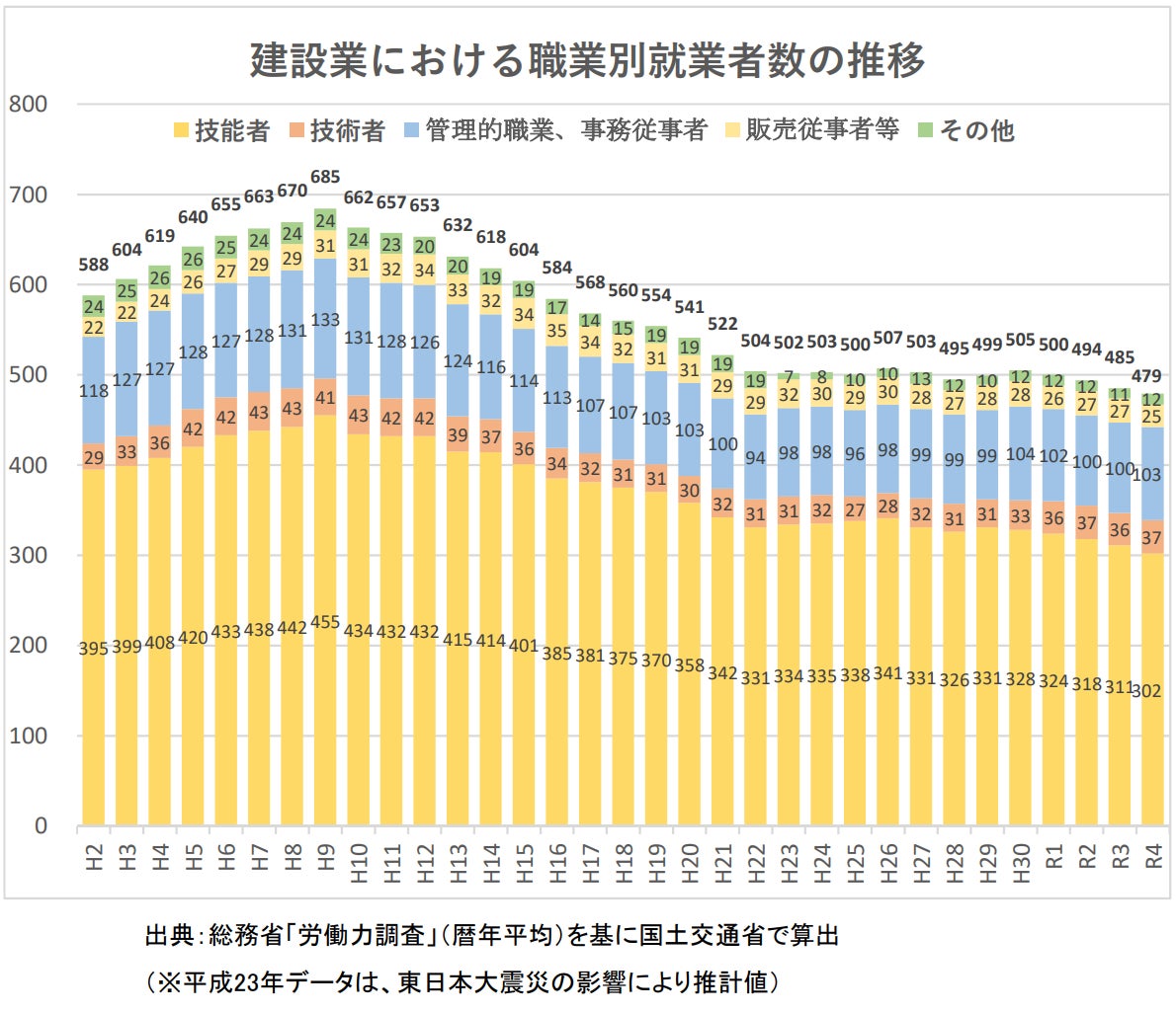 現在、建設業における就業者数(令和4年平均)は479万人で、ピーク時(平成9年平均)から約30%減少しています。