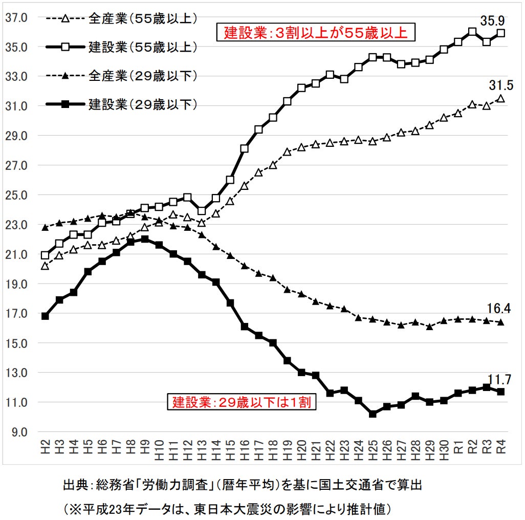更に、全産業と比較した場合に、建設業は、55歳以上が35.9%、29歳以下が11.7%と高齢化が進行し、次世代への技術承継が大きな課題となっています。