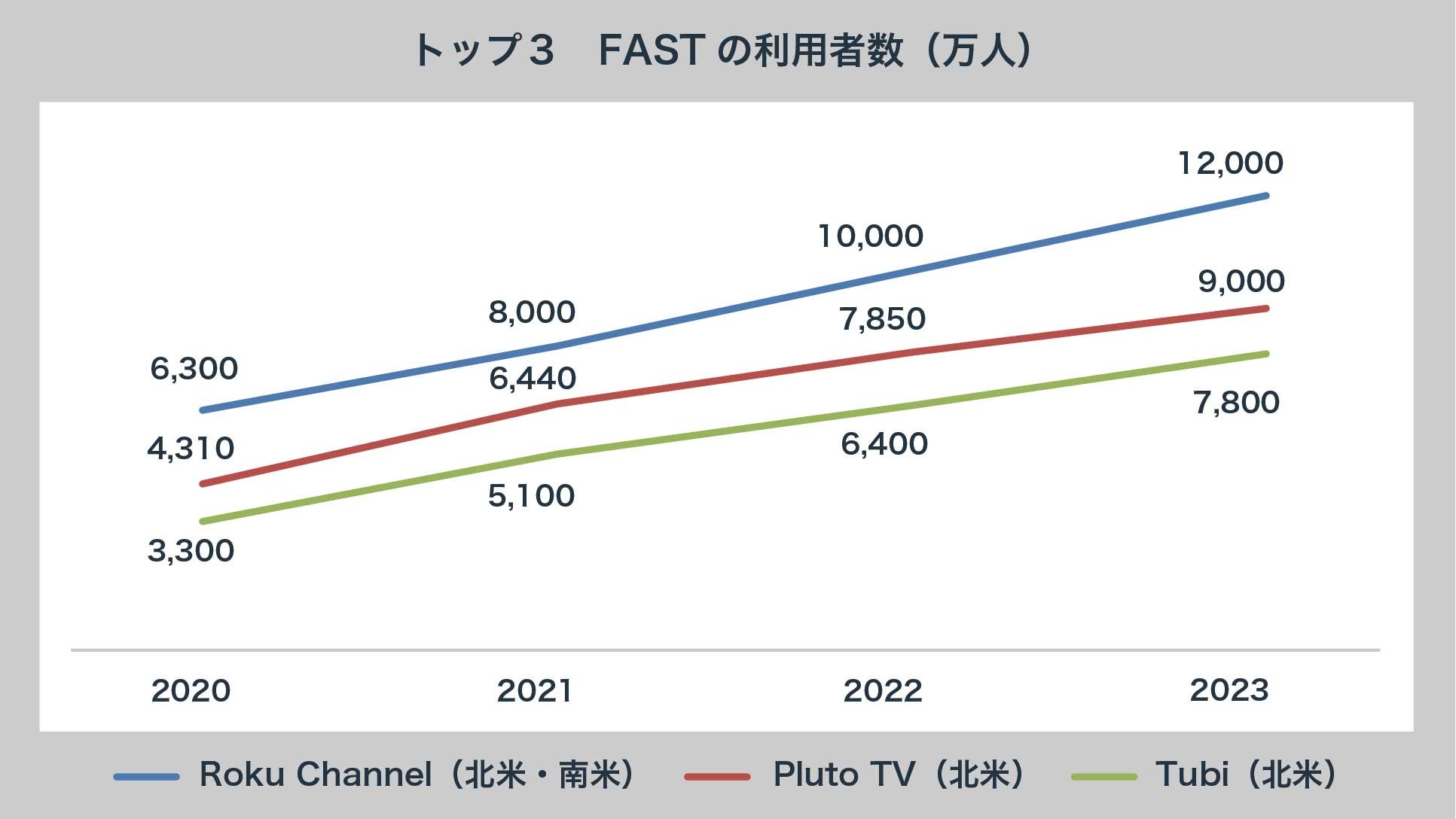 北米の代表的な「FAST」サービスの利用者数は、20万本を超える映画とテレビ番組、約200本のオリジナル作品が揃い約250チャンネルを展開するTubiでは約7,800万人、ワーナー・ブラザースやライオンズゲートなどと提携し約350チャンネルを展開するPluto TVが約9,000万人、米国で最も人気のあるFASTサービスであると言われ約340チャンネルを展開する Roku Channelでは約12,000万人です。近年利用者とチャンネル数を大きく伸ばしており、特にRoku Channelでは、従来の有料テレビプロバイダー最大手6 社の加入者数の合計を上回る勢いです。