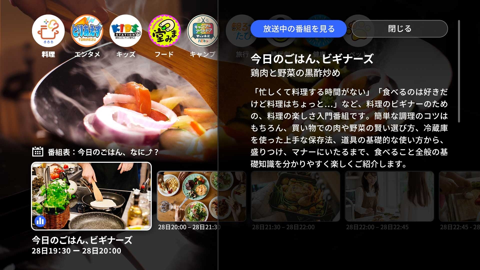 従来のテレビ放送のように、チャンネルを選択するだけで番組が次から次へと流れてくるため、膨大な映像の中から見たい番組を探す労力を極力無くし、好きなジャンルの番組をSVOD(サブスクリプション・ビデオ・オン・デマンド)・定額制動画配信サービスとは違い、無料で気軽に楽しめる新たなサービスです。