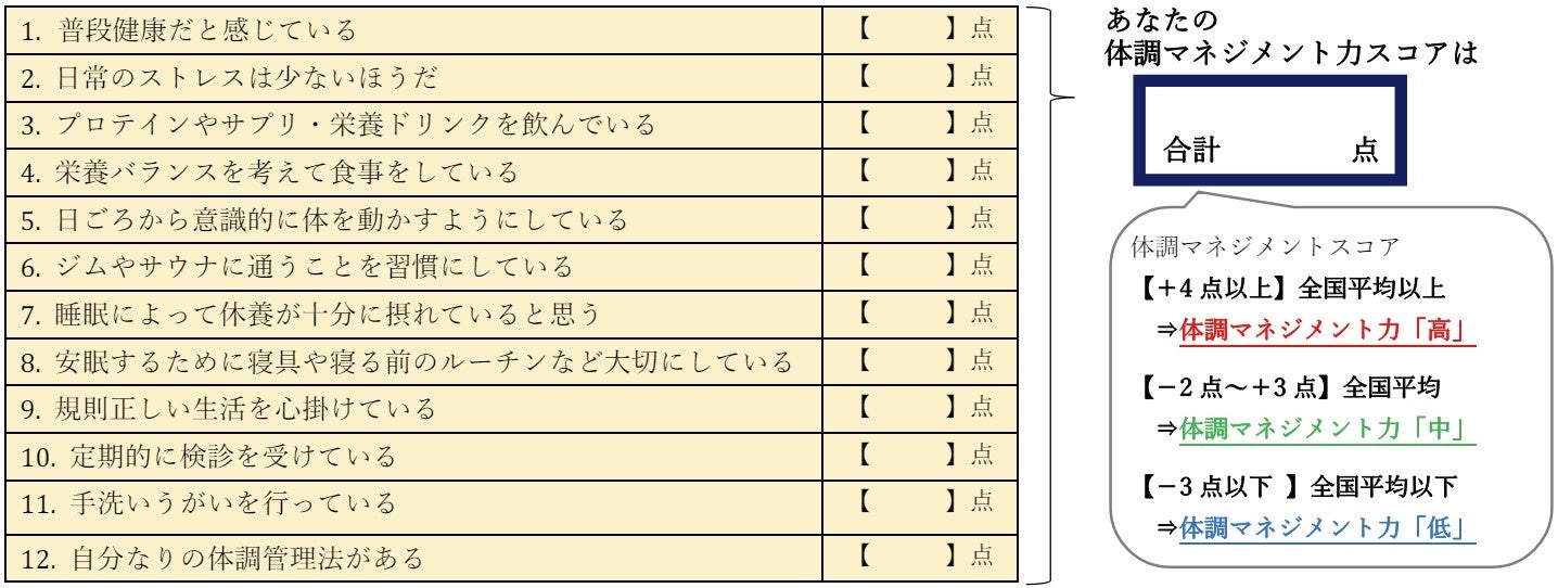 本調査では、健康に過ごすために大切な12項目をあげ、できているかどうかを「あてはまる(2点)」「ややあてはまる(1点)」「どちらともいえない(0点)」「あまりあてはまらない(-1点)」「あてはまらない(-2点)」のいずれかで答えてもらい、その合計点により「体調マネジメント力」を算出しました。