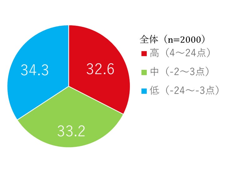 合計点が4点以上を体調マネジメント力「高」(651人、全体の32.6%)、3点〜−2点を体調マネジメント力「中」(664人、33.2%)、−3点以下を体調マネジメント力「低」(685人、34.3%)の3つに分類しました。本調査では、体調マネジメント力の合計点が最も高かった人は「24点(1名)」で、逆に最も低かった人は「-24点(2名)」という回答結果でした。