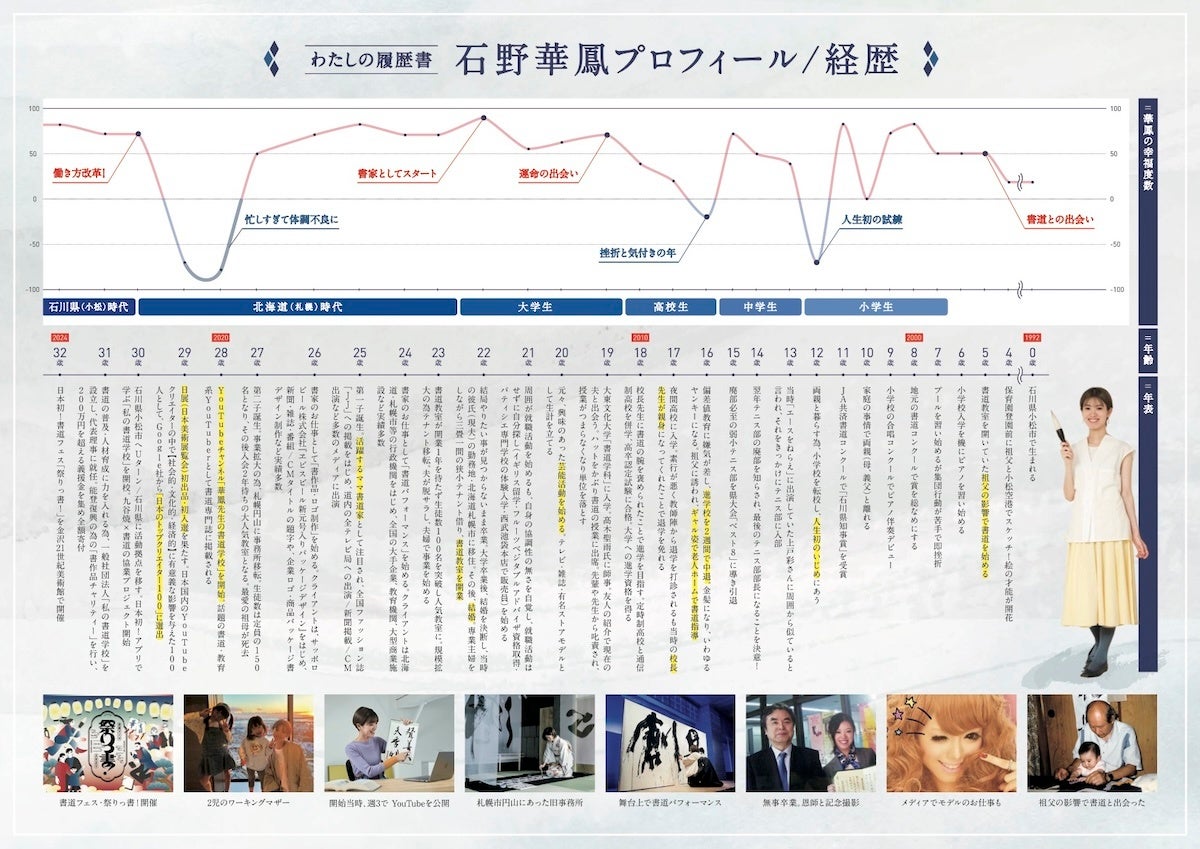 書道の先生をしていた祖父の影響で5歳で書と出会う。高校を2週間で中退しギャルに。通信高校で校長先生に勧められた書道の名門大学に進学。就活が嫌で、大学卒業後すぐに北海道で書道教室を開講。より多くの人が自由に学べるよう、書道教室をオンライン化。(「私の書道学校」2024年7月現在500名超)。書の魅力をYouTubeで発信。「日本を代表するYouTubeクリエイター100」選出。