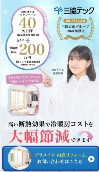 特別割引価格40%OFFキャンペーン実施中の「三協テック株式会社」が最大200万円の「先進的窓リノベ2024補助金」活用をアピールするテレビCM放送を開始!