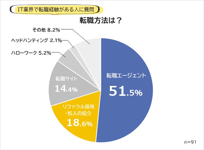 そこで今回、株式会社R&G( https://r-andg.jp/ )は、運営ブログ( https://r-andg.jp/blog/ )内において、現在IT業界にお勤めで転職経験がある91人に「IT業界の転職事情」についてアンケート調査を実施。その結果をランキング形式でまとめました。