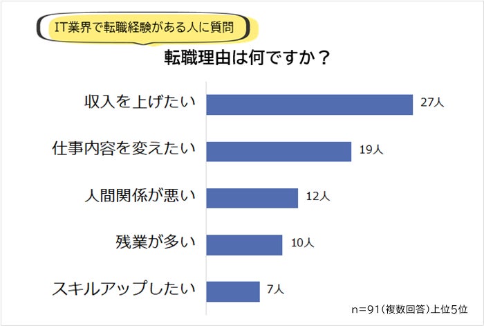 現在IT業界にお勤めで転職経験がある91人に「転職理由」を聞いたところ、「収入を上げたい(27人)」が1位でした。2位「仕事内容を変えたい(19人)」、3位「人間関係が悪い(12人)」と続きます。