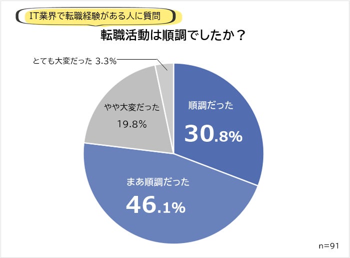 「転職活動が順調だったか」との問いには、76.9%が「順調だった」「まあ順調だった」と回答。IT業界は人手不足であることから、スムーズに転職活動を終えた人が多いとわかります。