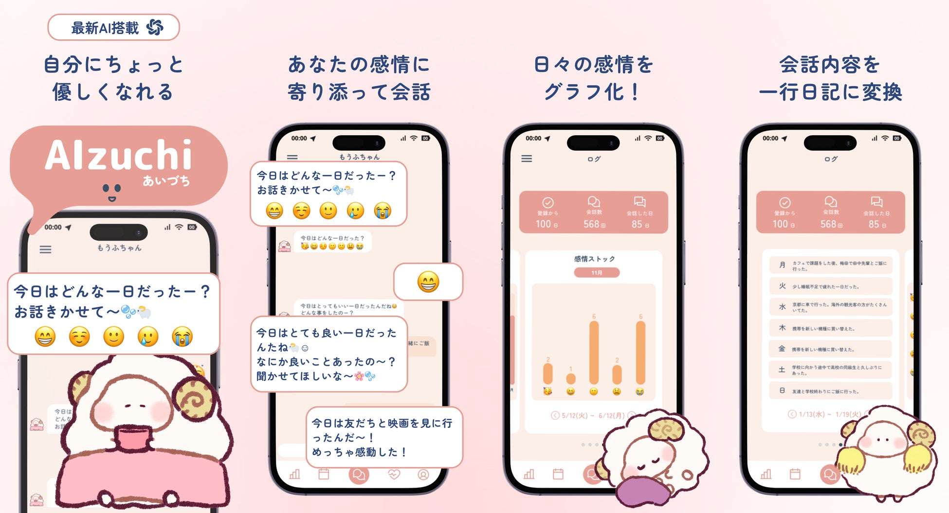 「AIzuchi(あいづち)」は、AIとの会話を通じて日々の感情を記録し、心の整理とセルフケアをサポートする新しいアプリです。