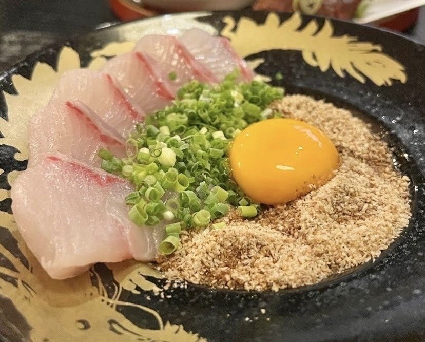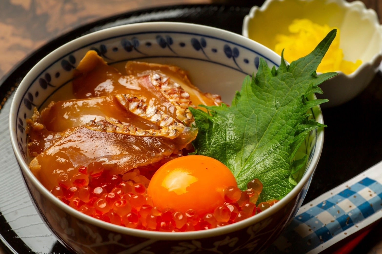 新鮮な伊勢まだいの刺身と濃厚な卵黄、そしてプチプチとしたイクラが贅沢に盛り付けられた一杯。