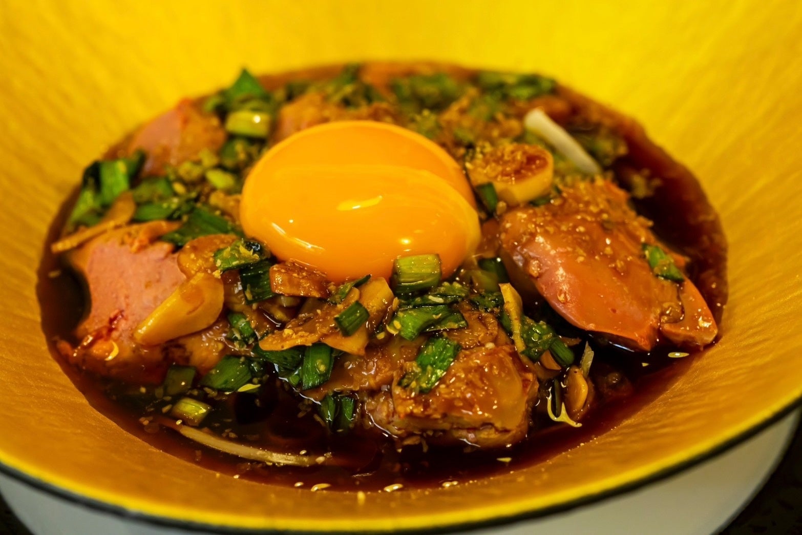 中心に置かれた生卵、そして周囲に細かく刻まれたネギと胡麻を散りばめたことで、見た目の華やかさも演出しました。