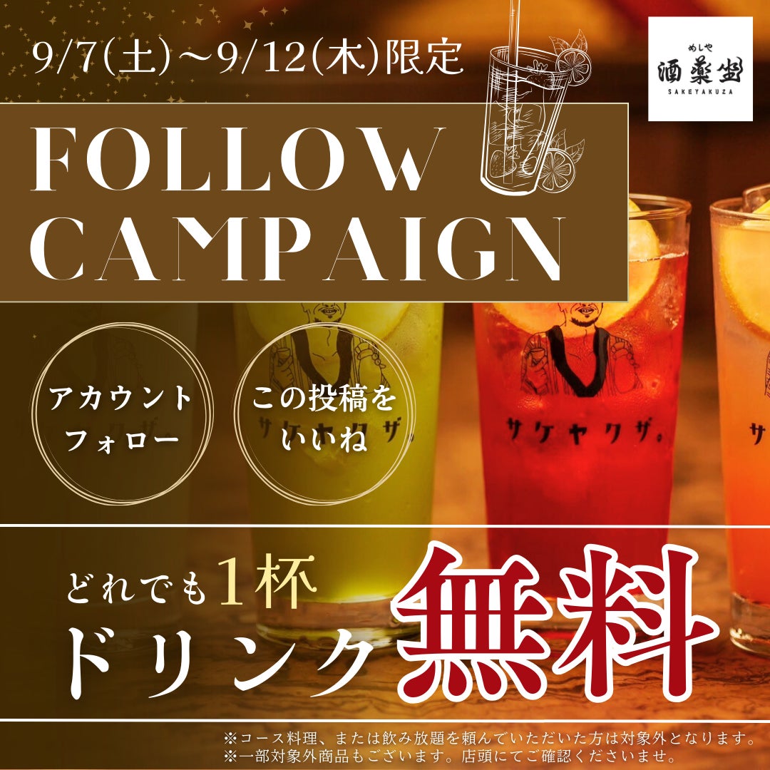 9月7日(土)~9月12日(木)の期間限定で、公式Instagramをフォローいただいた方にドリンク一杯無料でご提供いたします。