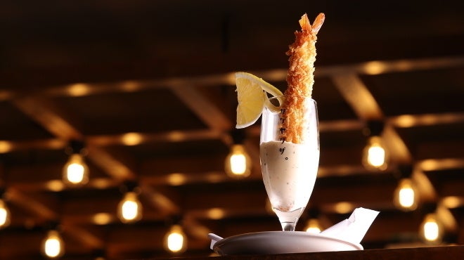 大きな有頭エビを豪快に味わっていただきたく、エビを頭からタルタルソースにダイブさせたメニューです。