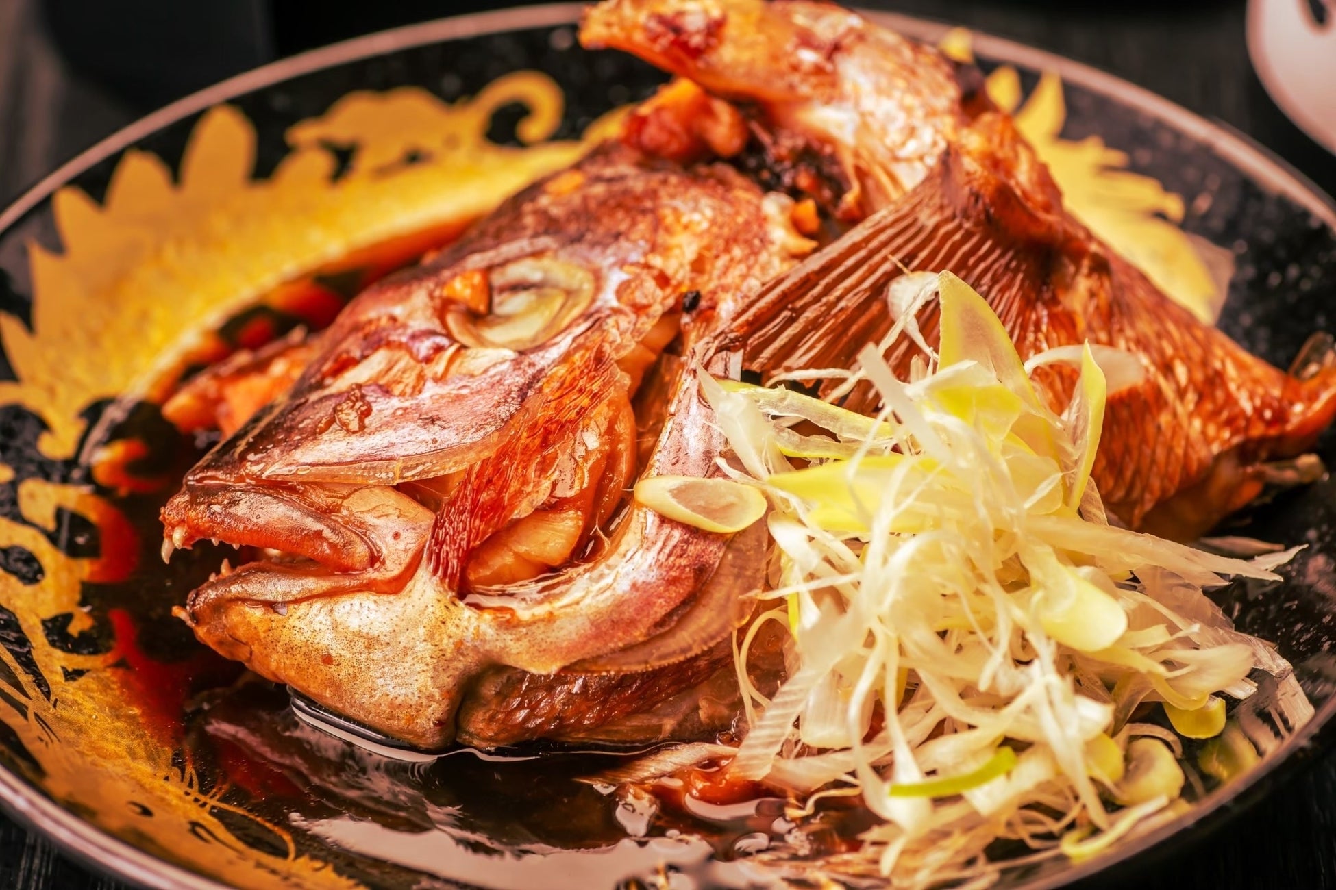 伊勢まだいの兜を甘辛く炊いた、豪快な大皿料理。