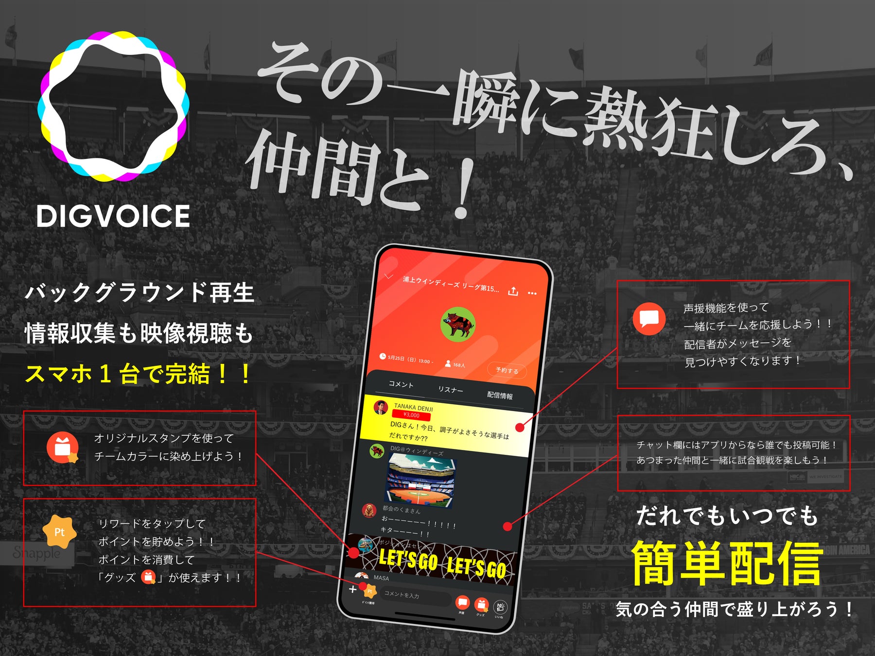 視聴者参加型スポーツ実況アプリケーション「DIGVOICE」は、スポーツ観戦で感じる一瞬の熱狂を、どこにいてもユーザー同士で共有することができるスマートフォン向けサービスです。さまざまなスポーツの試合中継を一緒に観戦しながら、実況者としてファンが自分の音声を視聴者に届けたり、またリスナーとして他の人の配信に参加したり、ファンが一緒に盛り上がることで、まるでスタジアムにいるかのような臨場感を体験することができます。このたび「DIGVOICE」のさらなる成長および事業拡大を目指して、今後はヒアートゥーが「DIGVOICE」を運営し、音声を通した新しい発見や共感を得られるサービスを提供していきます。