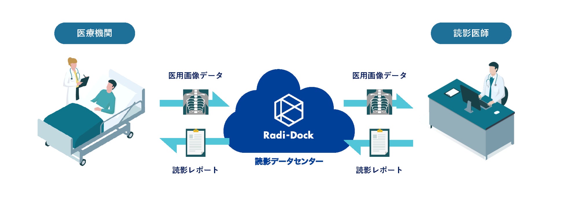 「Radi-Dock(ラジドク)」とは、医療機関と読影医をインターネットでつなぎ、遠隔で支援するサービスです。専門医師による読影の所見をレポートとしてまとめ、それを返却することで医療機関の診断をサポート。