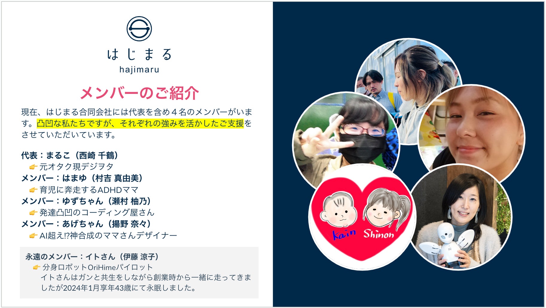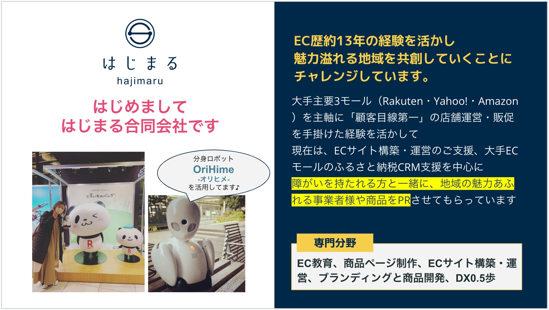 主に鹿児島県内の事業者・自治体におけるECサイト(ネットショップ)運用やブランディングの支援を行う企業。メンバー全員が女性で、なおかつ半数が発達障害を持っているのが特徴。「だれかのはじめるをはじまるに」をモットーとして掲げ、さまざまな事情で新しいことを「はじめる」のが難しい方に対し、最適なアプローチを提供することで、物事が「はじまる」流れを作っています。