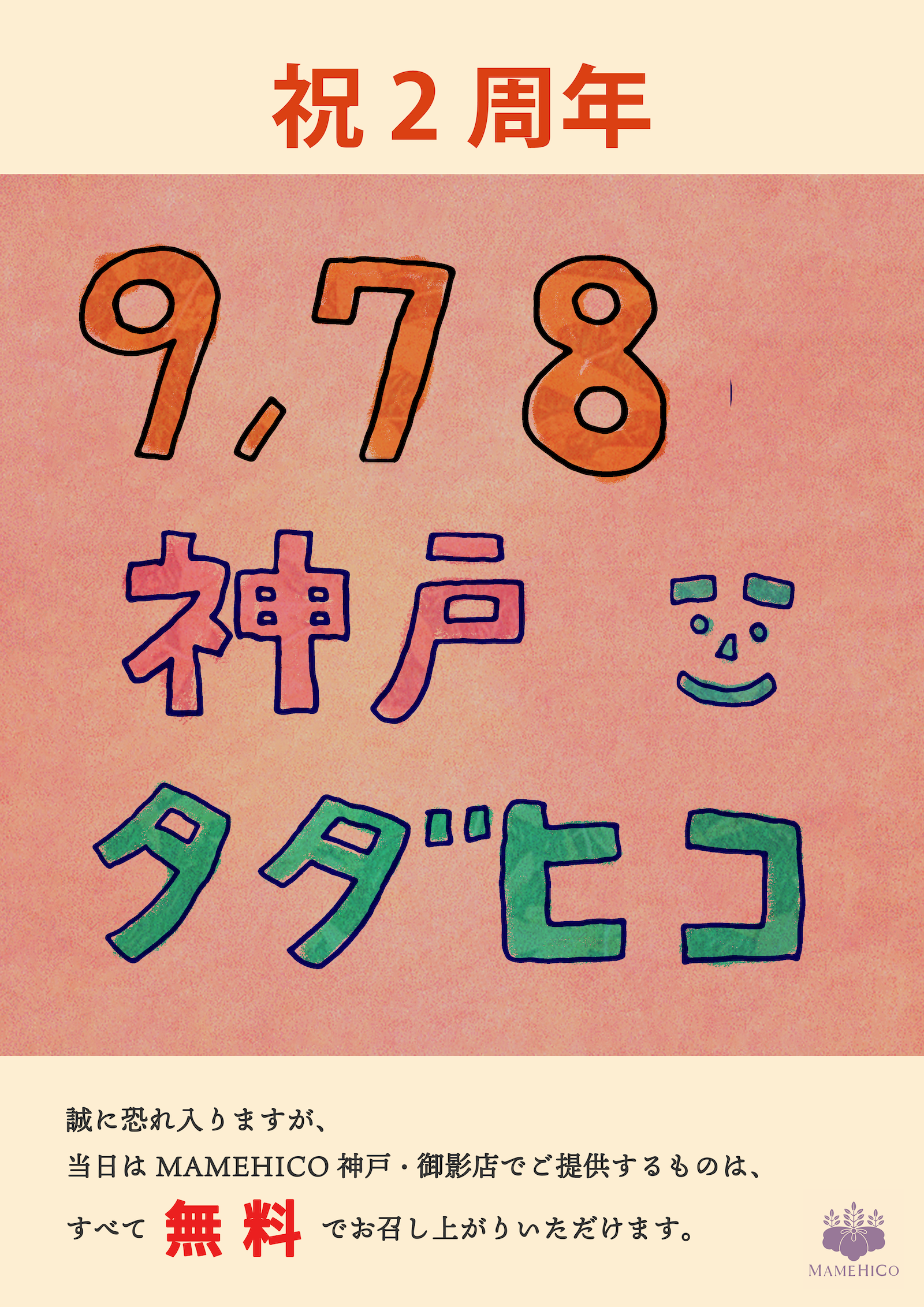 メンバーシップ制のイベントカフェMAMEHICO 神戸・御影は、オープン2 周年を迎えるにあたり、初めての試みとして「タダヒコ」を開催いたします。