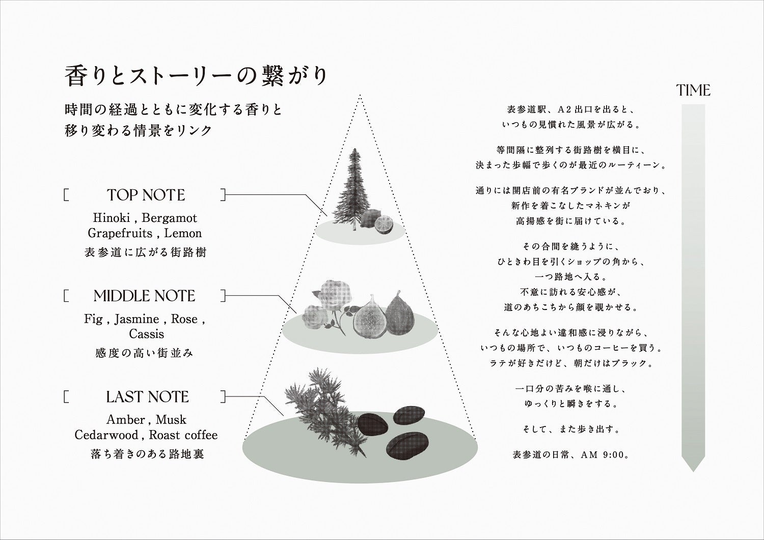 時間の経過と共にTop→Middle→Lastと変化していく香りと、ストーリーの中で移り変わる情景をリンクさせることで自らがそこを歩いているかのようなリアルを感じられる唯一の香りを生み出します。