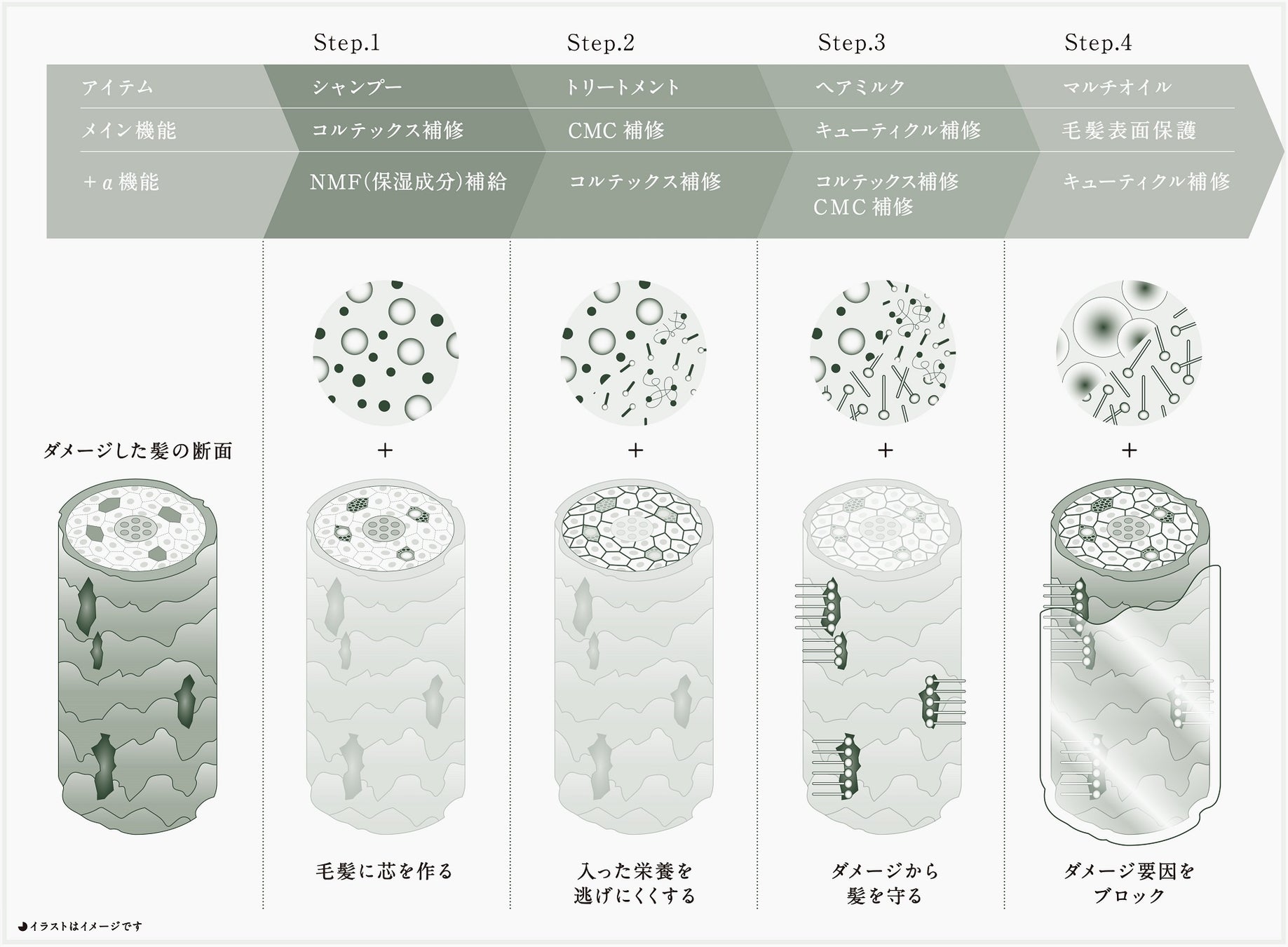 ダメージレベルに合わせて栄養の通り道を補修。うるおいを保つ毛髪へと導くトリートメント