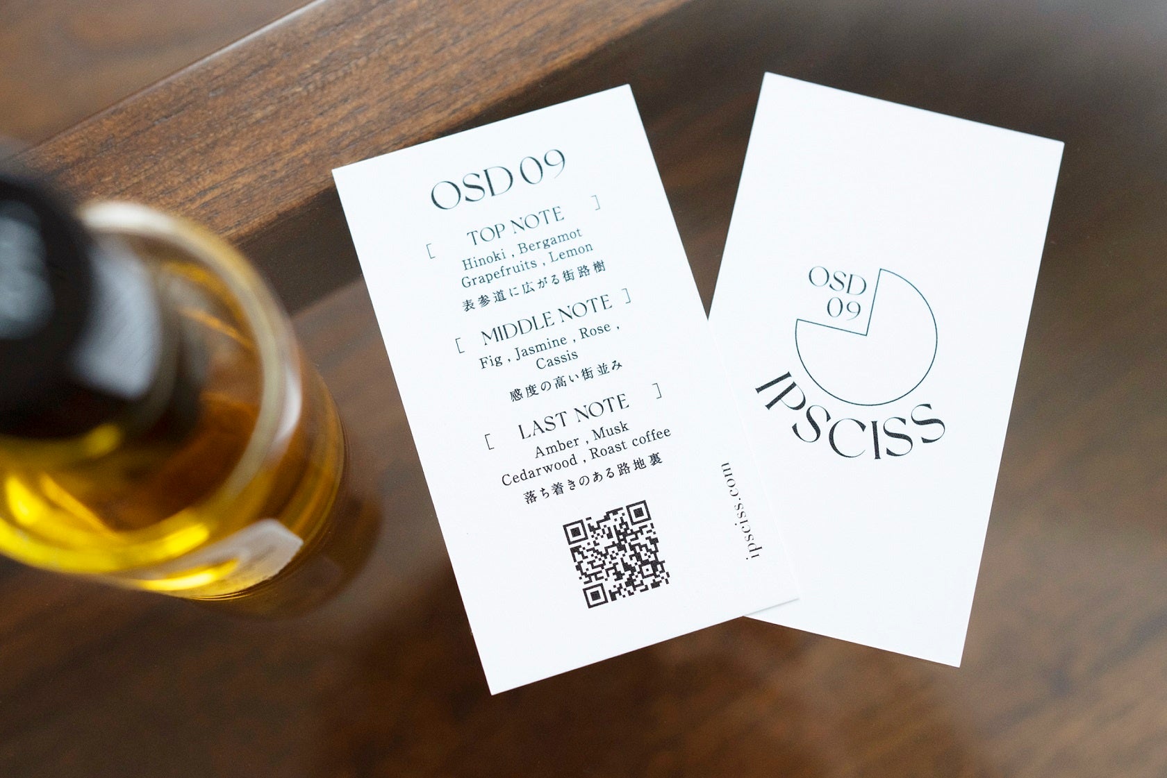 「IPSCISS」では、商品像を連想しやすいように商品特長に合わせ、具体的な都市を3文字の略語としライン名にしています。今回は多様なヘアデザインの方が多く、感度の高いブランド・ショップが集まる表参道をピックアップし「OSD」と名付けました。09は時刻を表し、朝の9時を意味します。OSD09では、表参道のサロンに勤務する美容師が朝9時に出勤する情景を香りで表現しています。