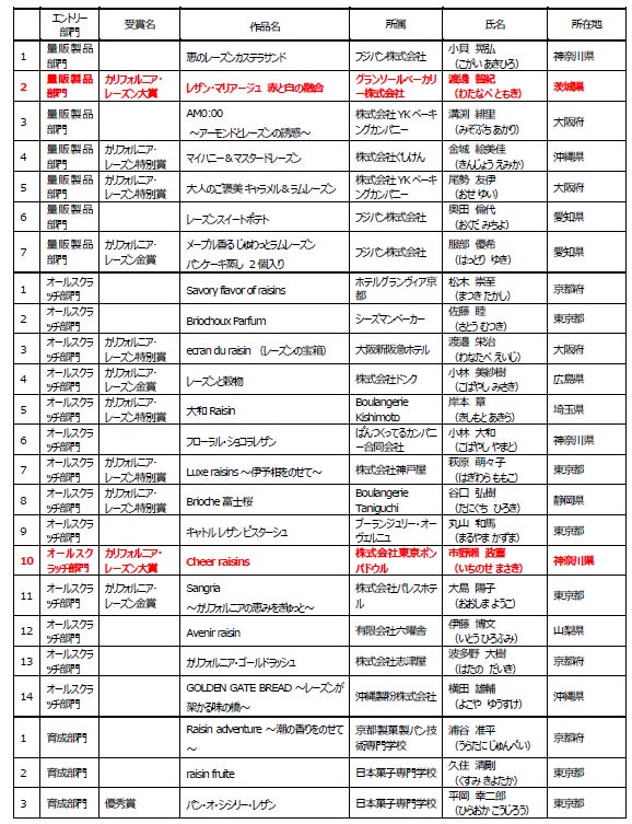ファイナリストの21名には楯が授与され、副賞として、量販製品部門とオールスクラッチ製品部門の11名にはカリフォルニア・レーズンの故郷「カリフォルニア州フレズノへの研修旅行」、育成機関部門の1名には賞金15万円(ギフト券)が贈られました。
