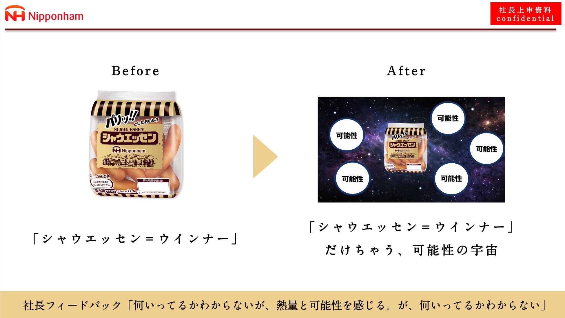 皆様に愛していただき、シャウエッセンは発売40年目を迎えます。しかし、いやだからこそ、ロングセラーに甘んじない挑戦姿勢を真摯に伝えていけたらと思い本プロジェクトが始まりました。日本ハムでは社員一同「商品を愛すること」を大切にしています。どこまで我々の愛情が伝わるか不安ですが、少しでもみなさまにパリッと焦がれる胸の思いをお届けできますと幸いです。