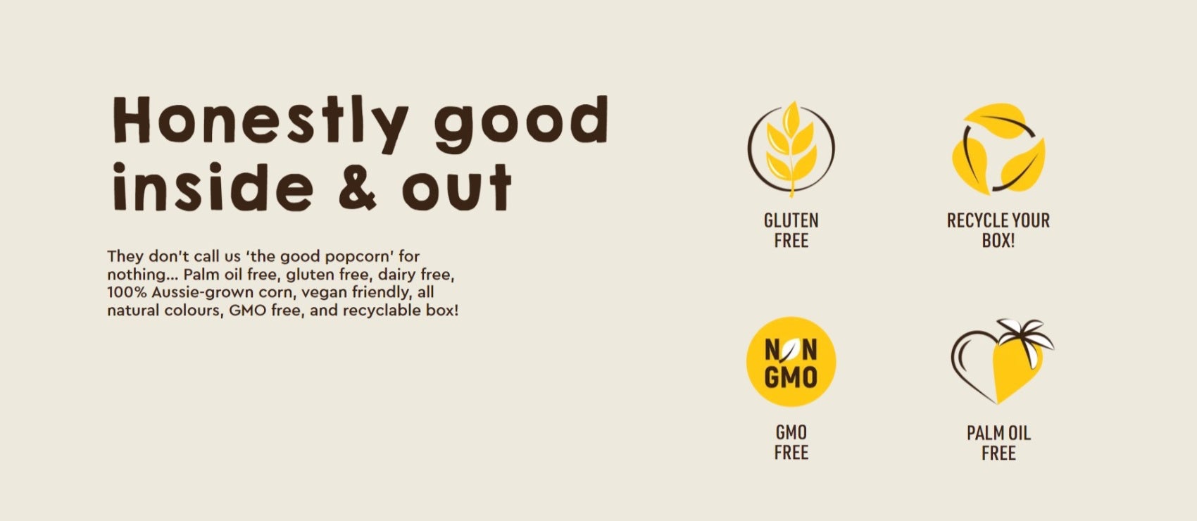 - PopBoxは100%オーストラリア産、遺伝子組み換えゼロのコーンを使用しています。