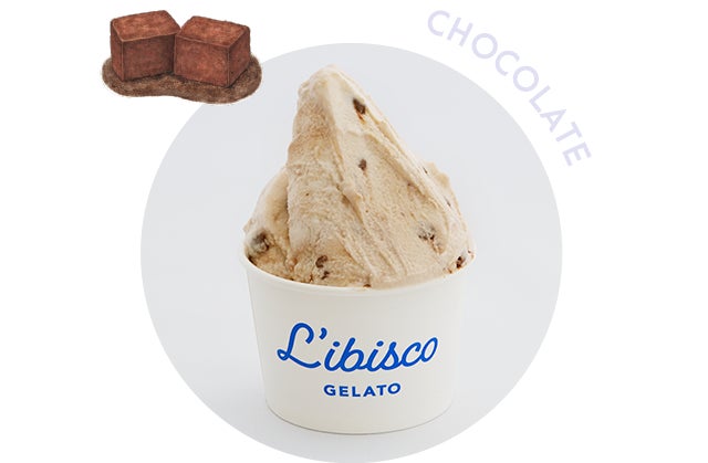 カカオ55%の上質なチョコレートを使ったリビスコ自家製生チョコを、相性抜群のオブセ牛乳ジェラートと組み合わせている。