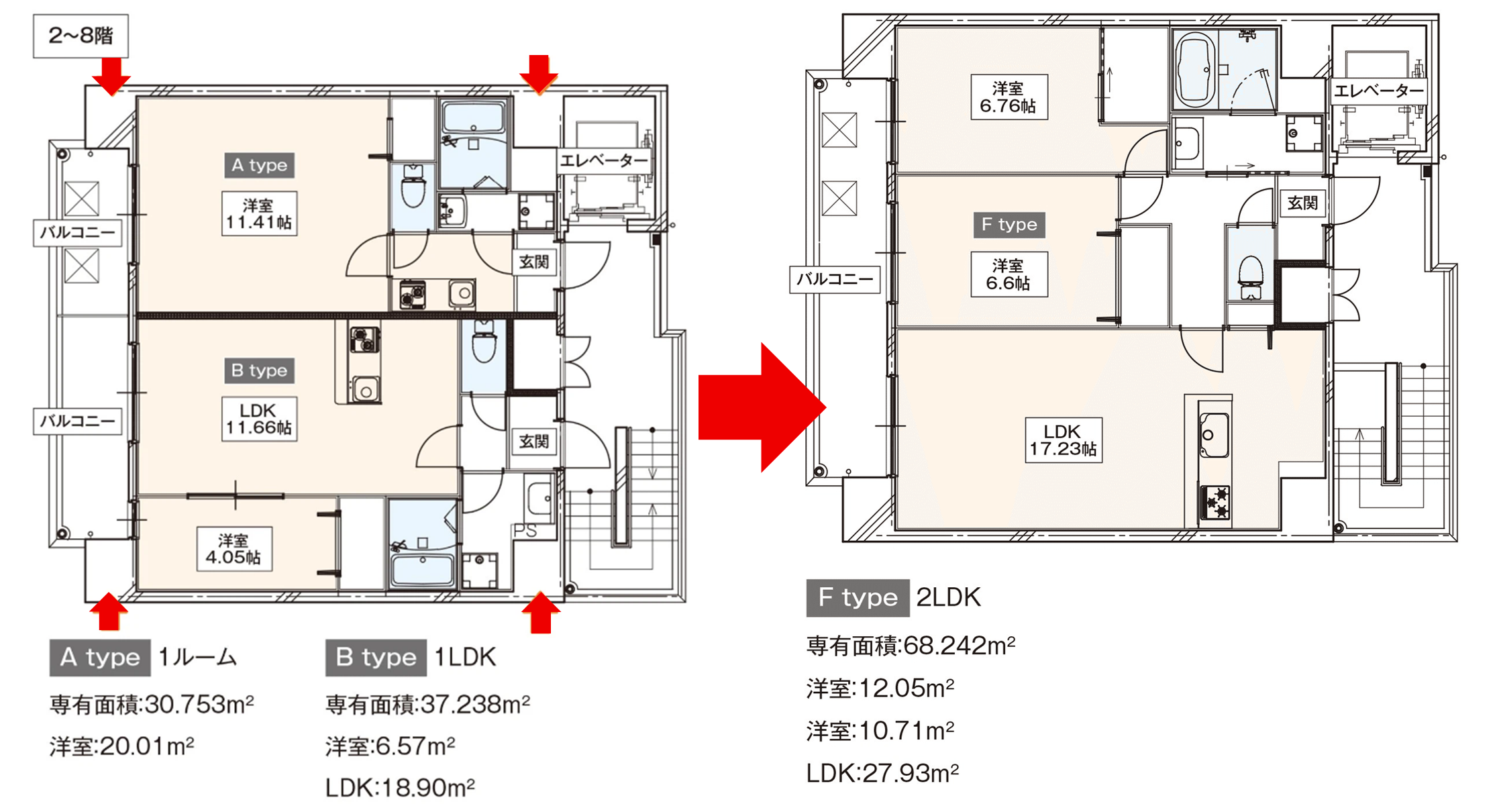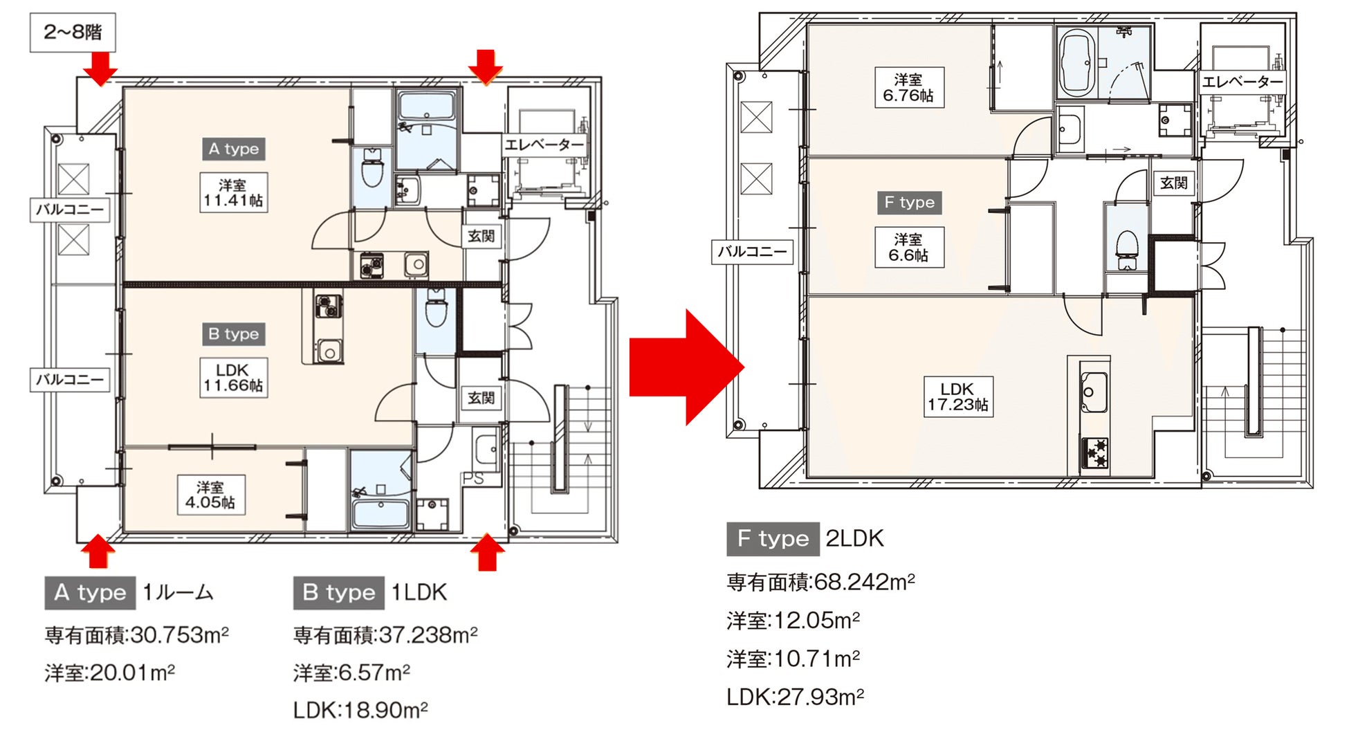 例えば、当社が建設したマンション「LaLa Glanz NAMBA(下図)」では、躯体部分は矢印で示した4つの柱と床の基礎のみで構成されています。間取りを仕切る「間仕切り壁」は躯体を支えるものではないため、取り除いて大規模な間取り変更が可能です。
