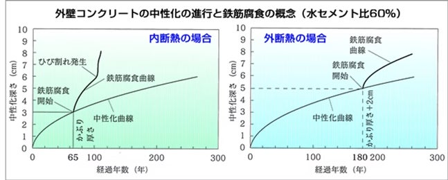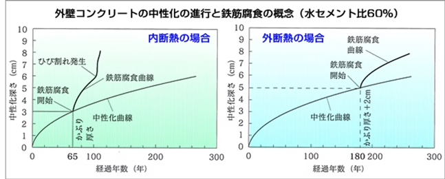 以下のグラフは、内断熱と外断熱におけるコンクリート中性化の進行を比較したものです。