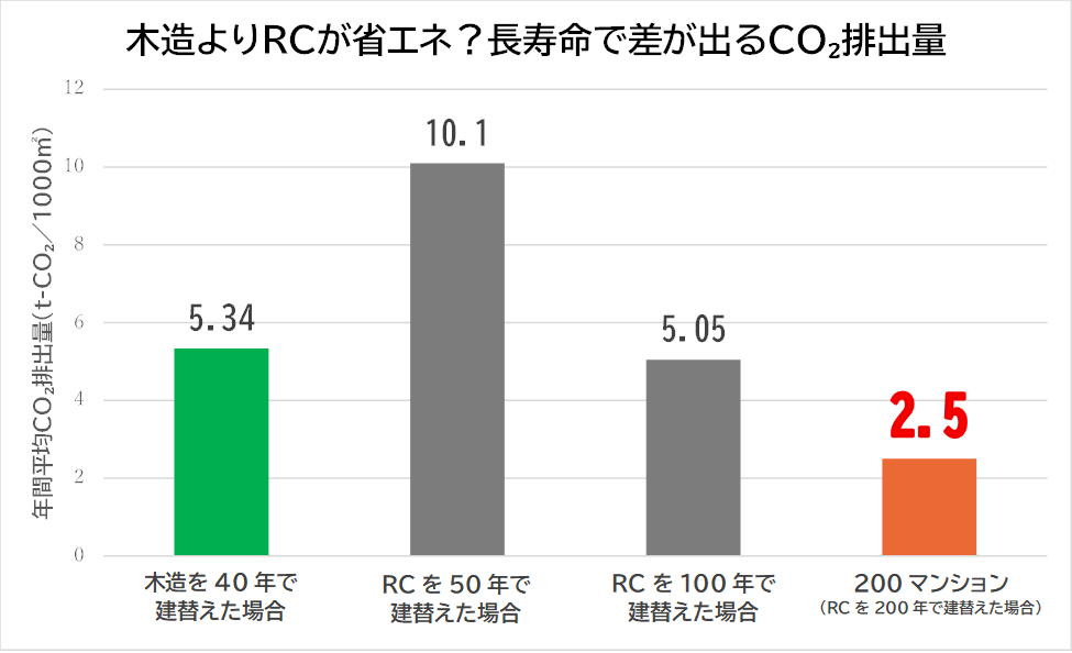 「長寿命化したコンクリート住宅は木造よりもエコである」という逆転の視点が浮かび上がります。