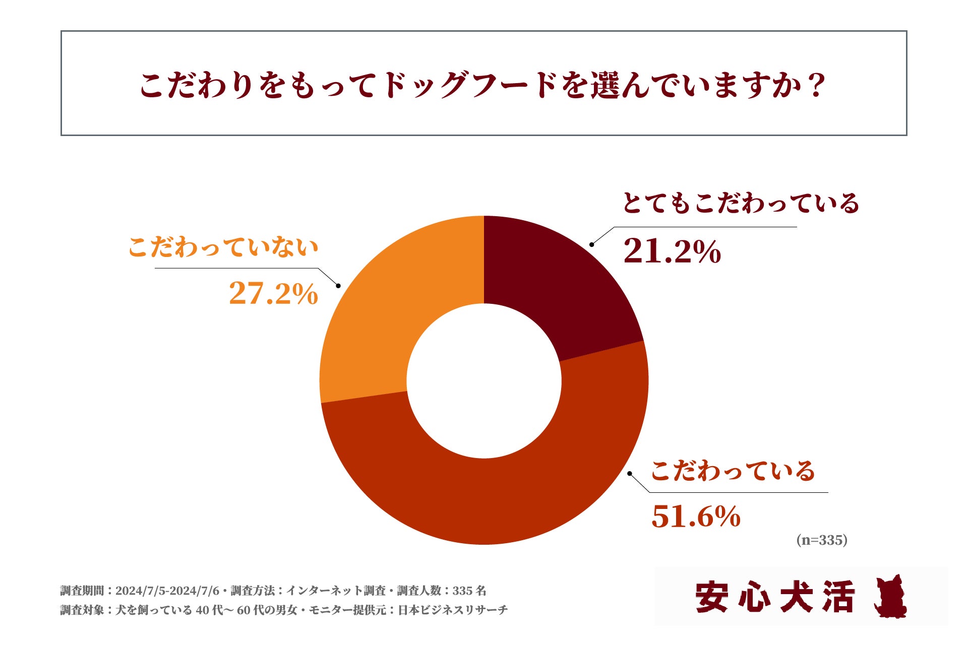 まず、「こだわりをもってドッグフードを選んでいるか」という設問への回答では、「こだわっている」が51.6%。「こだわっていない」が27.2%、「とてもこだわっている」が21.2%という結果になりました。「こだわっている」と「とてもこだわっている」を合計すると7割以上となり、犬を飼っている多くの方がドックフード選びにこだわりをもっていることが明らかになりました。