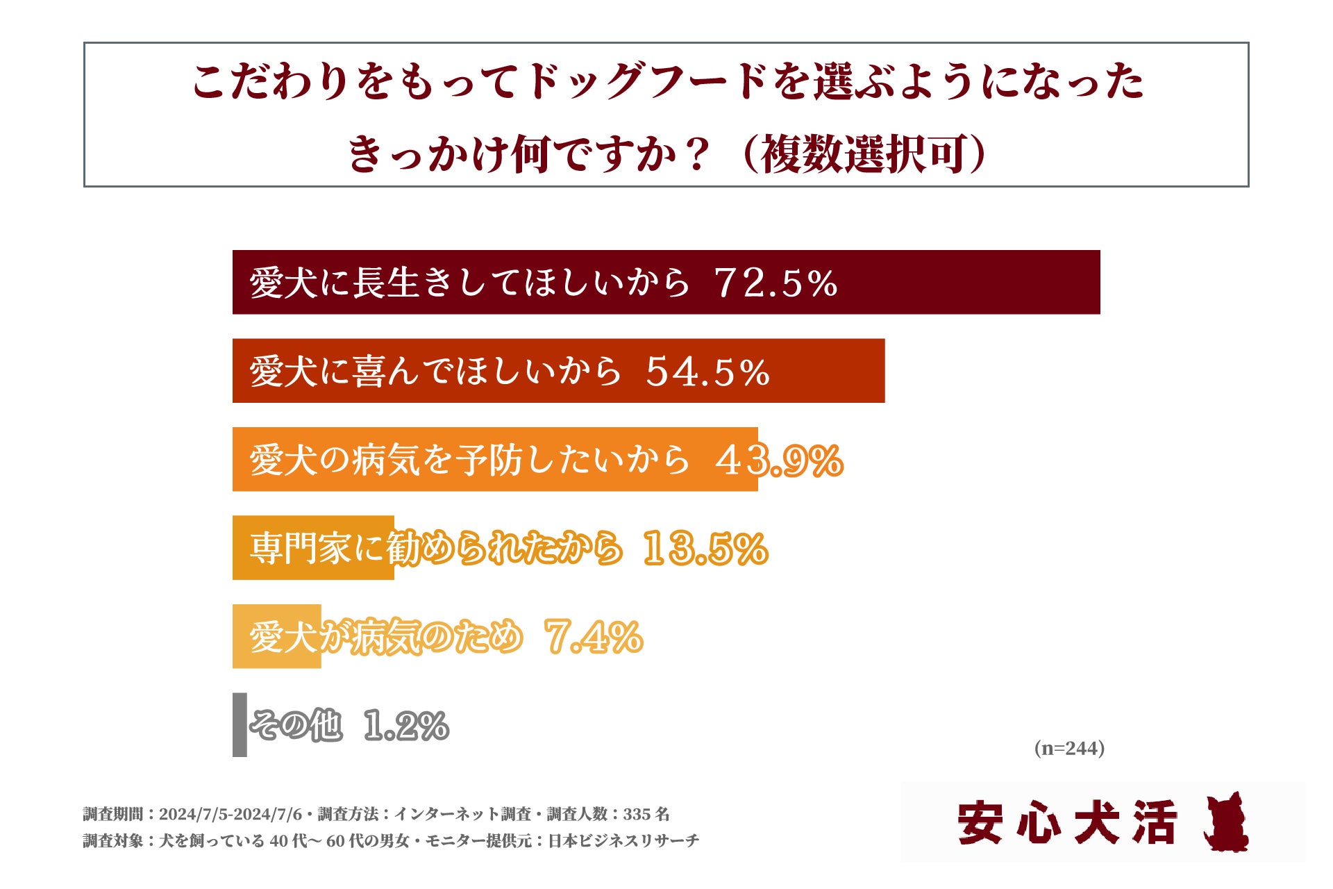 次に、前項の質問で「こだわっている」もしくは「とてもこだわっている」と回答された方に「こだわりをもってドックフードを選ぶようになったきっかけ」を問う設問への回答で1位となったのは「愛犬に長生きしてほしいから」で72.5%、2位は「愛犬に喜んでほしいから」で54.5%、3位は「愛犬の病気を予防したいから」で43.9%となりました。この結果から、愛犬の長寿や幸せ、健康のためにドッグフードにこだわっている方が多いとわかりました。