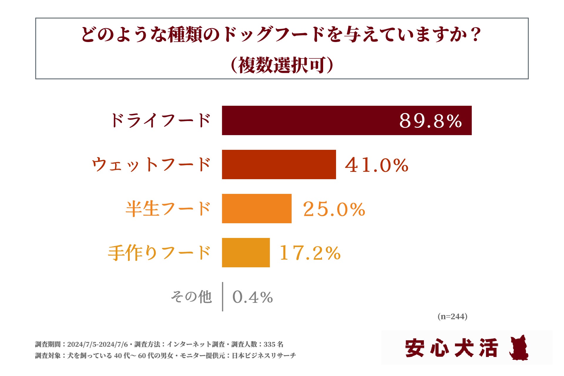 次にドッグフード選びに「こだわっている」もしくは「とてもこだわっている」と回答された方に「どのような種類のドックフードを与えているか」を問う設問では、1位が「ドライフード」で89.8%、次いで2位が「ウェットフード」で41.0%という回答になりました。この結果からドッグフードの種類では、ドライフードが多くの支持を集めていることが判明しました。