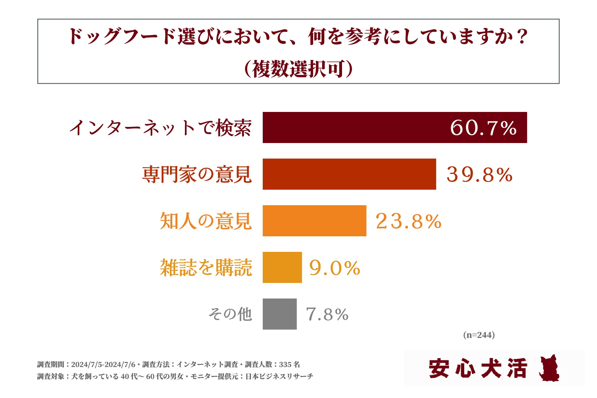 最後に、ドッグフード選びに「こだわっている」もしくは「とてもこだわっている」と回答された方に「ドックフード選びにおいて、何を参考にしているか」を問う設問の回答では、1位が「インターネット検索」が60.7%で、2位が「専門家の意見」で39.8%、3位が「知人の意見」で23.8%という結果となりました。この結果から、ドッグフード選びにおいては、直接人を介して知る情報よりもインターネットを介して得る情報を参考にしている方が多いと明らかになりました。