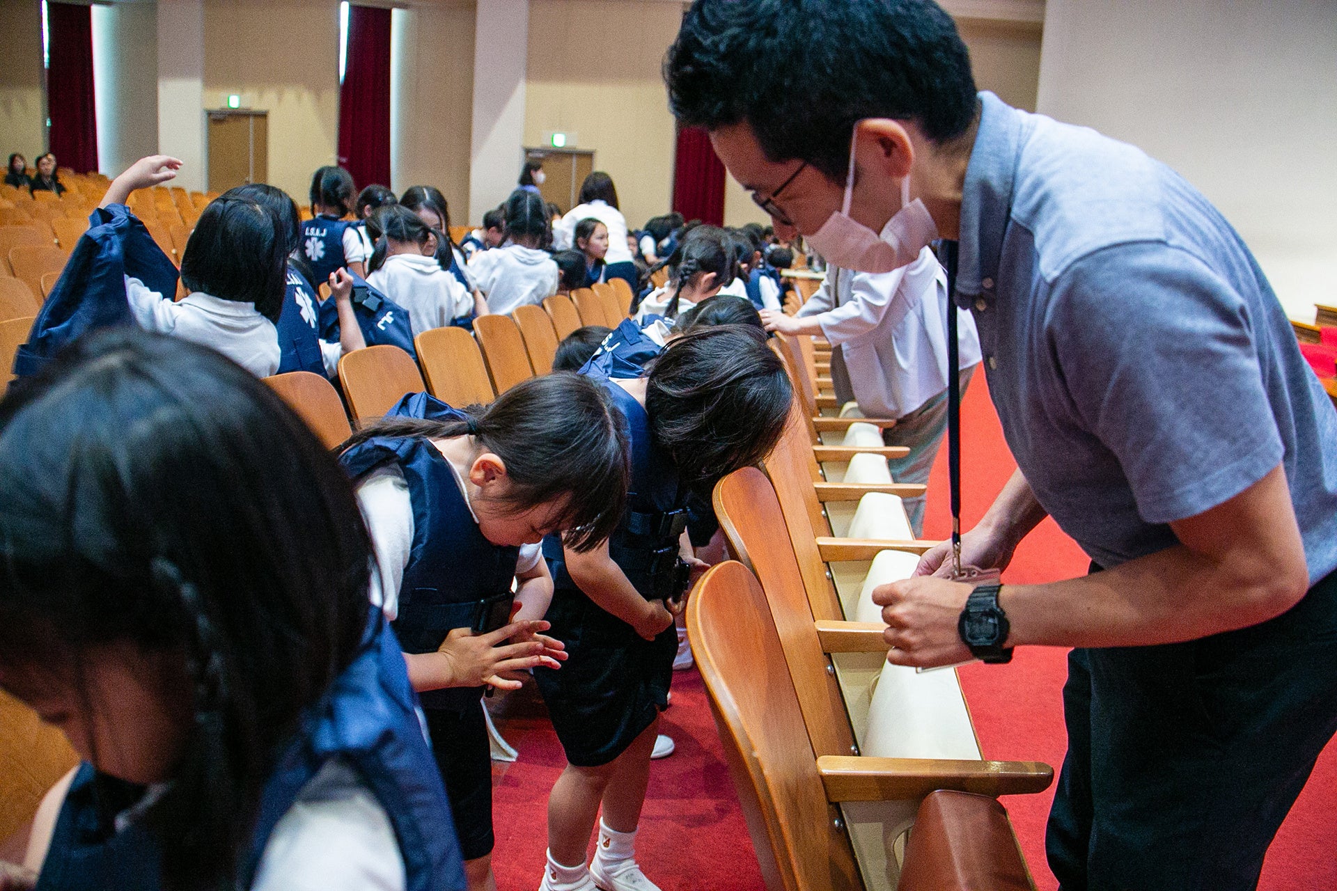 清泉小学校では毎年、防災訓練を実施しており、災害時には全校生徒が校舎屋上に避難する際、屋上に設置しているライフジャケットの着用を推進しています。