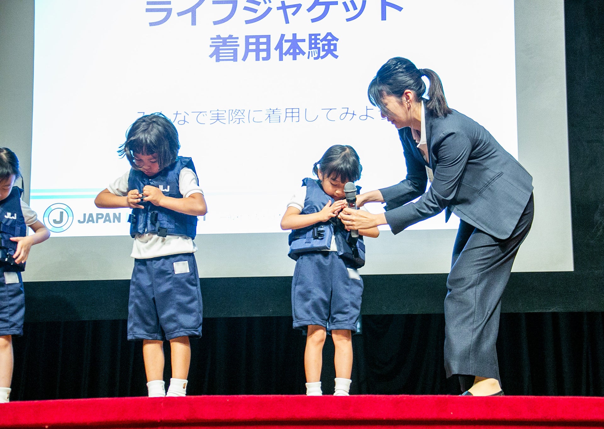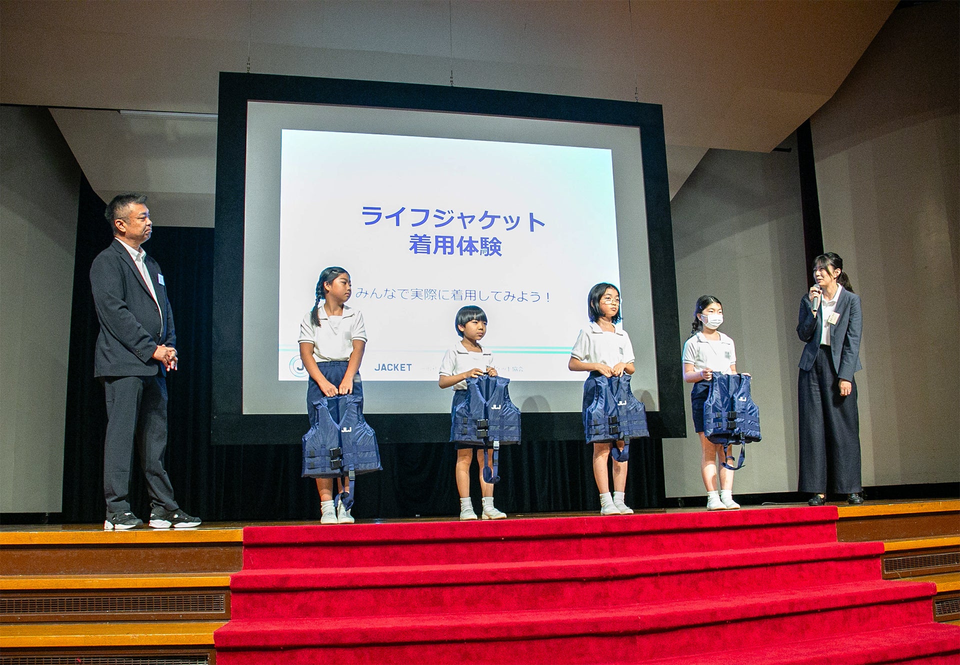 着用方法の動画を用いて、子どもたちが実際にライフジャケットを着用する体験が行われ、「ライフジャケット着用体験会〜『まさか!?』に備えて〜」というテーマで、正しい着用方法やその重要性についての説明が行われました。