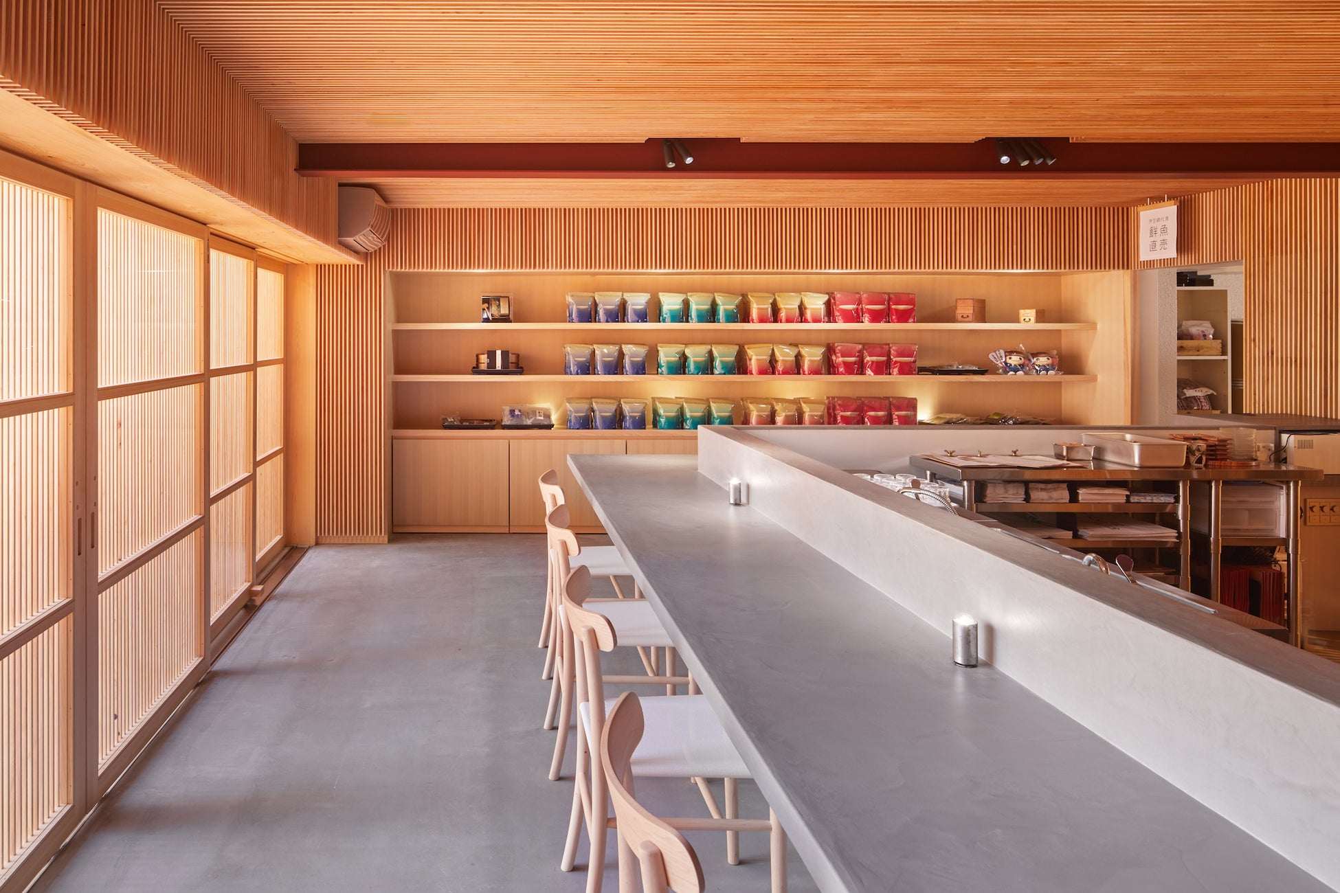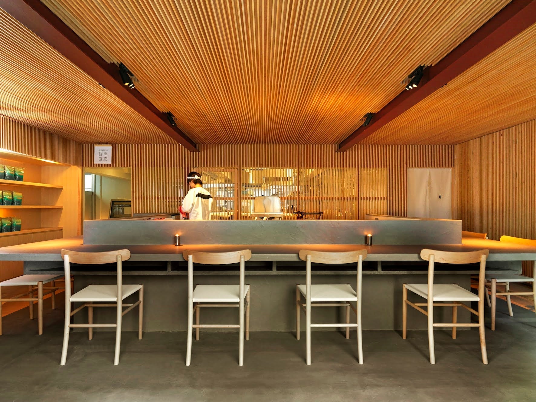 カウンター12席を設けた店内は、伝統と新しさをテーマに木材の温かみと漁港の雰囲気をモルタルで表現したシックなデザインです。