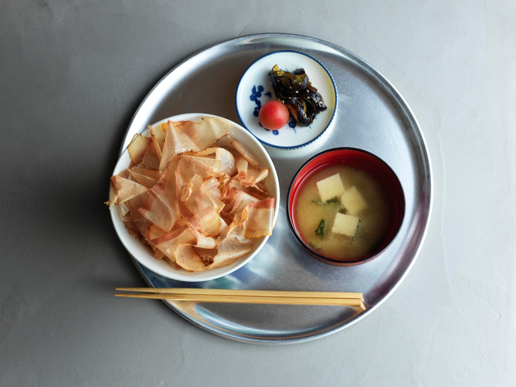 メニューは、目の前で0.02ミリの厚さに削ったかつお節をご飯にのせた「ほやほや削りごはん」、「お茶漬け」、「おむすび」など、シンプルに削り節を味わってもらう食事を提供しています。