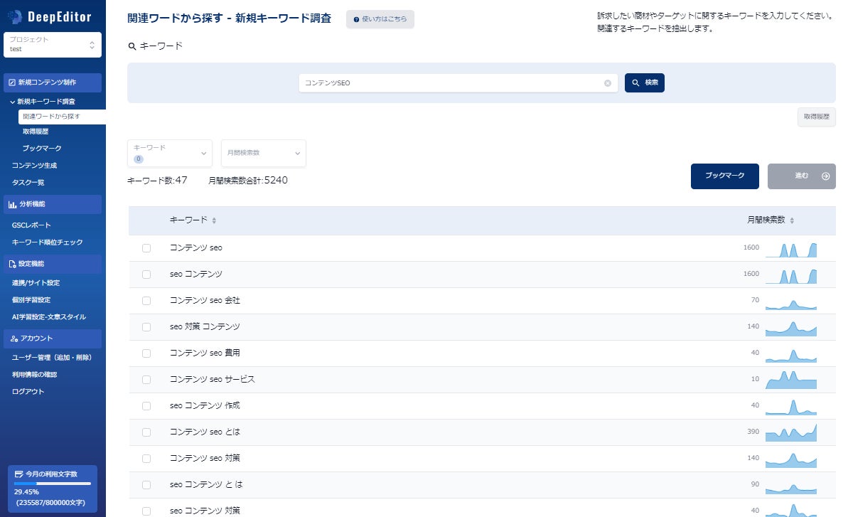 キーワードを入力するだけで、関連の深いキーワードとその月間検索ボリュームが一覧表示されます。検索ボリュームの変化やユーザーの検索意図も一目でわかるので、直感的にコンテンツ制作すべきキーワードを選定可能。さらに、すぐに制作しないキーワードはブックマークに保存しておくこともできます。