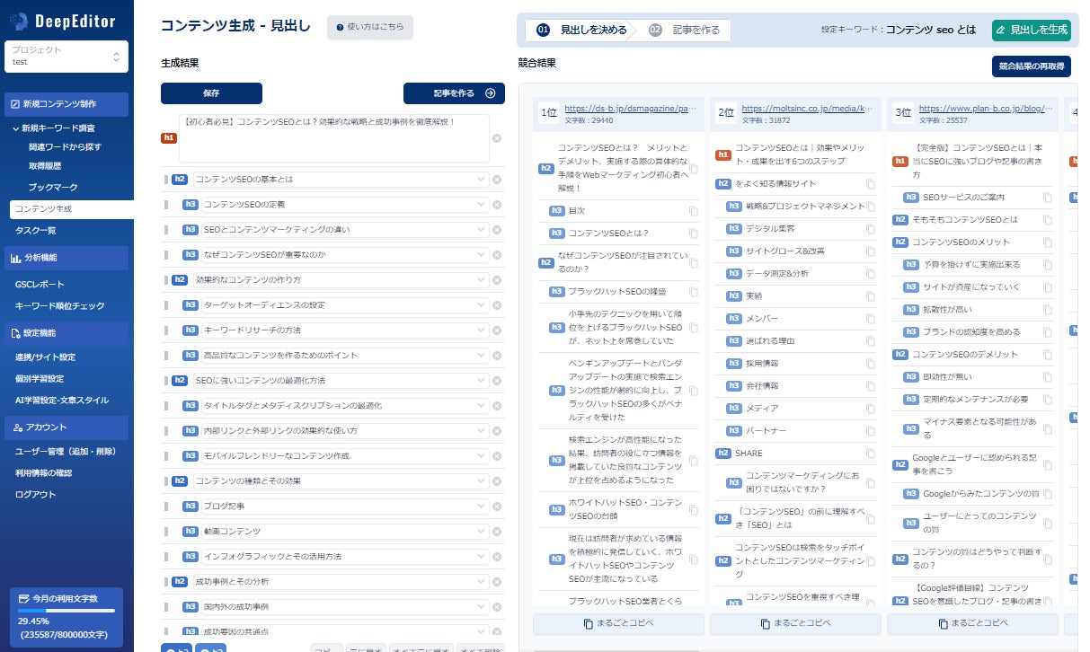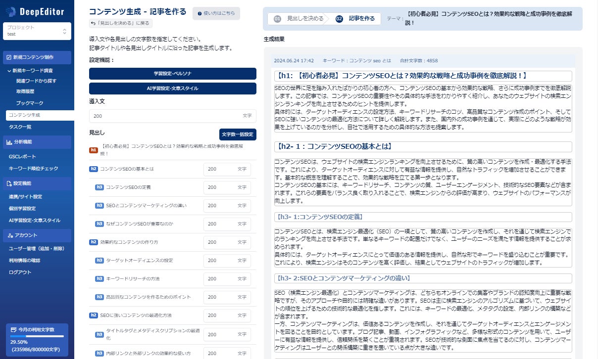 株式会社ipe(本社:東京都港区、以下「ipe」)は、オールインワンのAIライティングツール「DeepEditor」を新たにリリースしました。SEOコンサルで培ったノウハウを盛り込み、成果の出るSEOコンテンツの企画・作成を一括サポート。キーワード調査から記事の見出し・テキスト生成、さらにはアップ後の記事の効果測定まで、「DeepEditor」のみで対応可能です。社内外の工数を従来の約1/10にまで削減できるので、浮いた時間を人間にしかできない作業に充てていただけるでしょう。