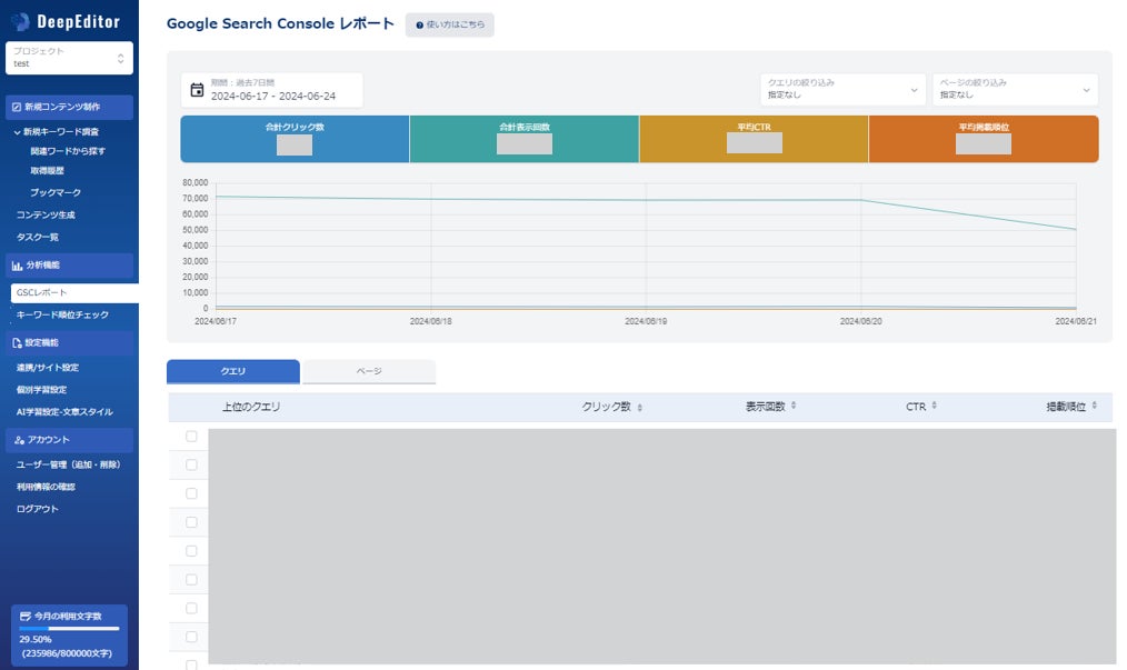 作成した記事のキーワード順位を毎日自動で計測・更新します。「Google Search Console」と連携することで、記事ごとのクリック数やクリック率の確認も可能。グラフを通じて変化度合いを確認でき、記事の成果が一目でわかるほか、リライトすべきタイミングも判断しやすくなります。