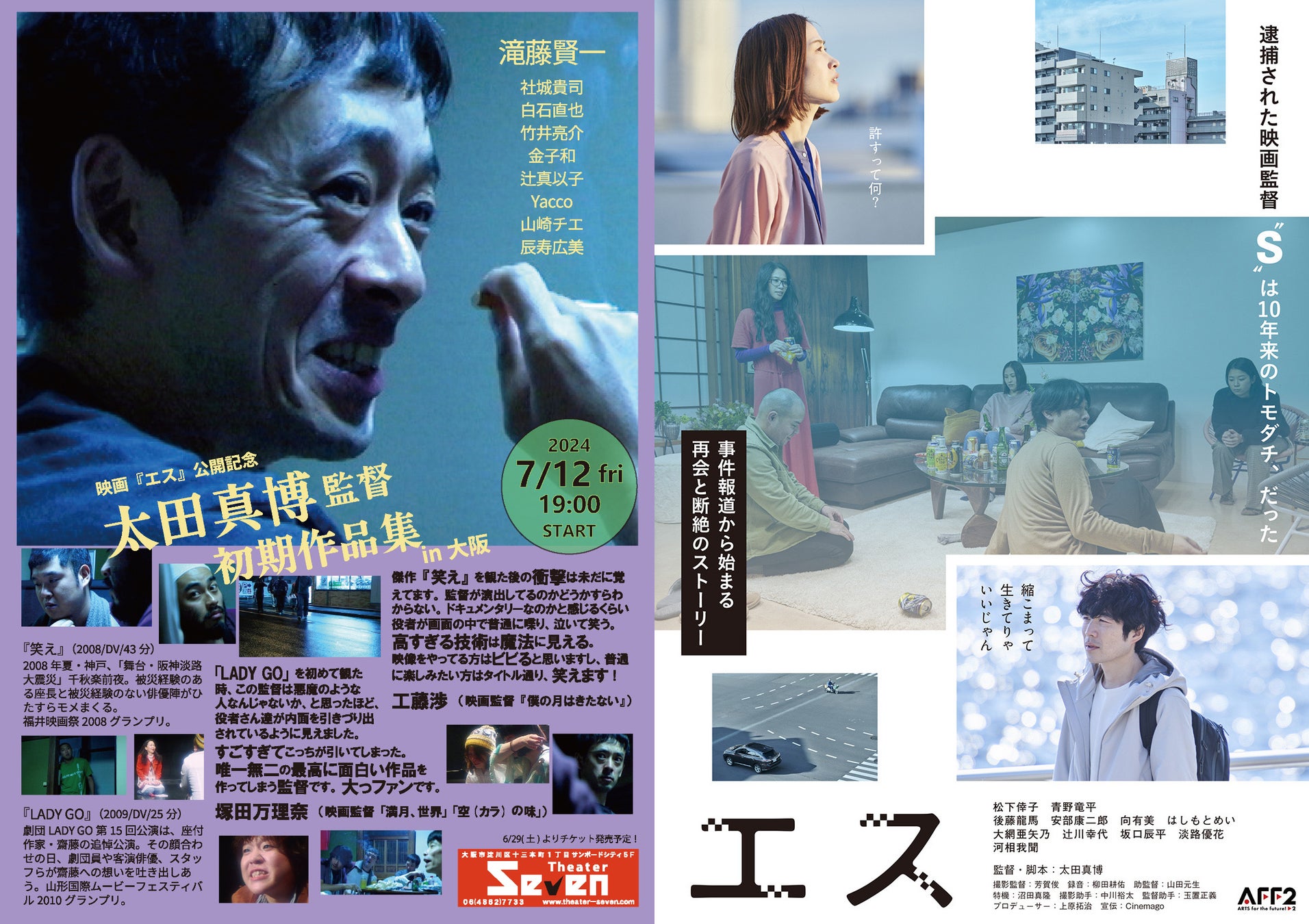 2024年7月12日(金)19:00~、大阪十三のシアターセブンで開催のされる「太田真博監督初期作品集in大阪」にて滝藤賢一主演映画『笑え』が上映されます。併映は山形国際ムービーフェスティバル2010グランプリ『LADY GO』。おなじくシアターセブンで太田真博監督の最新作『エス』が7月20日(土)より公開されることを記念しての特別上映です。